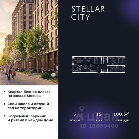 Продается квартира от надежного застройщика Tashir Estate в квартале бизнес-класса Stellar City в ЗАО Москвы. Площадь квартиры составляет: 72.6 кв. м, потолки: 3.1 м Квартира находится на 15 этаже, 4 корпуса жилого квартала Stellar City — микрогорода будущего на орбите Москвы. Stellar City — квартал в ЗАО Москвы вблизи инновационного центра Сколково. В окружении — 11 парков и природных зон, в том числе Долина реки Сетунь, Мещерский лес и парк развлечений The Rink. Город в городе Чтобы дом и инфраструктура вокруг отвечала динамичному лайфстайлу жителя мегаполиса, в основу проекта легла концепция город в городе, которая позволяет решать все бытовые вопросы in-home. В квартале будут возведены школа и детский сад, воркаут-зоны, променад, вело и беговые дорожки, детские площадки для каждого корпуса, а также коммерция на первых этажах для ежедневных покупок. Все необходимое — на расстоянии нескольких шагов. Изящные и лаконичные лобби Авторский дизайн, натуральные материалы в отделке и безупречный интерьер вне времени. Лобби и холлы в проекте бизнес-класса Stellar City ничем не отличаются от входных групп в премиум-сегменте благодаря качественным европейским материалам в отделке, стильному дизайну, консьерж-сервису и уютной зоне ожидания с журнальными столиками и мягкой мебелью. Комфорт и безопасность Закрытая территория, охрана, система СКУД, специально разработанное мобильное приложение дома для резидентов и подземный паркинг с круглосуточным наблюдением и доступом с помощью автоматического считывания номера авто.