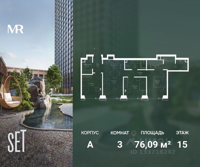 Прямая продажа от застройщика. В ЖК SET продается 3-к квартира площадью 76.09 м², расположенная в корпусе А, на 15 этаже 52 этажного дома. SET имеет стратегически выгодное расположение в ЗАО, в районе с большой историей и блестящим будущим: между природной зоной долины реки Сетунь и Кутузовским проспектом. В рамках возведения первой очереди предусмотрено три корпуса высотой 18, 45 и 59 этажей. На верхних этажах спроектированы общедоступные смотровые площадки с панорамным обзором на центр столицы. Преимущества проекта: • Функциональные планировочные решения • Контроль проникновения через входную дверь • Система управления освещением и температурой в квартире • Система защиты от протечек с функцией перекрытия воды • Вход в подъезд по биометрическим считывателям Face ID • Скоростные лифты • Двухуровневый подземный охраняемый паркинг на 495 машино-мест Застройка SET включает в себя не только жилые корпуса, но и инфраструктурные объекты. Все необходимое для повседневного комфорта будет расположено в шаговой доступности: • Фитнес-клуб с бассейном • Ведущая городская школа, детский сад и школа искусств • Центр культуры и досуга • Медицинский центр • Кафе и рестораны Расположение комплекса: Пешком: • Метро "Давыдково" - 17 минут • Парк "Долина реки Сетунь" - 3 минуты На машине: • "Москва-Сити" - 15 минут • Садовое кольцо - 20 минут • ТЦ "Океания" - 8 минут • ТЦ "Времена года" - 13 минут • Сколково - 12 минут • Гребной канал - 17 минут Компания MR Group предлагает своим клиентам специальные условия приобретения квартир в рамках программ ипотечного кредитования от банков-партнеров.