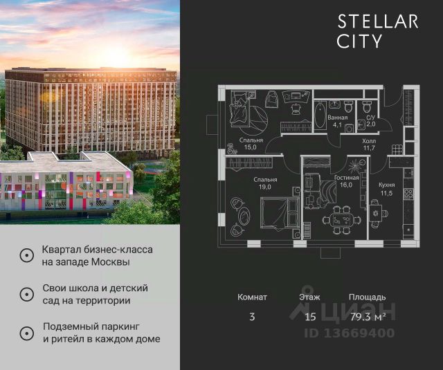 Продается квартира от надежного застройщика Tashir Estate в квартале бизнес-класса Stellar City в ЗАО Москвы. Площадь квартиры составляет: 94.7 кв. м, потолки: 2.9 м Квартира находится на 15 этаже, 4 корпуса жилого квартала Stellar City — микрогорода будущего на орбите Москвы. Stellar City — квартал в ЗАО Москвы вблизи инновационного центра Сколково. В окружении — 11 парков и природных зон, в том числе Долина реки Сетунь, Мещерский лес и парк развлечений The Rink. Город в городе Чтобы дом и инфраструктура вокруг отвечала динамичному лайфстайлу жителя мегаполиса, в основу проекта легла концепция город в городе, которая позволяет решать все бытовые вопросы in-home. В квартале будут возведены школа и детский сад, воркаут-зоны, променад, вело и беговые дорожки, детские площадки для каждого корпуса, а также коммерция на первых этажах для ежедневных покупок. Все необходимое — на расстоянии нескольких шагов. Изящные и лаконичные лобби Авторский дизайн, натуральные материалы в отделке и безупречный интерьер вне времени. Лобби и холлы в проекте бизнес-класса Stellar City ничем не отличаются от входных групп в премиум-сегменте благодаря качественным европейским материалам в отделке, стильному дизайну, консьерж-сервису и уютной зоне ожидания с журнальными столиками и мягкой мебелью. Комфорт и безопасность Закрытая территория, охрана, система СКУД, специально разработанное мобильное приложение дома для резидентов и подземный паркинг с круглосуточным наблюдением и доступом с помощью автоматического считывания номера авто.