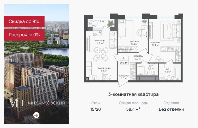 Ипотека для каждого! Полная стоимость кредита от 11,578% до 22,490%. Ставка от 0,11% в АО "Альфа-Банк" фиксируется на 1 год с даты заключения кредитного договора, далее полная стоимость кредита от 25,819% до 28,767% ставка 25,39% до окончания срока кредитования. Первоначальный взнос — от 20% от стоимости квартиры. Срок кредитования — от 3 до 30 лет. Скидка 9% при покупке квартиры! Цена указана с учетом максимального размера скидки. Идет выдача ключей. Продаётся 3-к квартира 85,5 кв.м. в ЖК "Михалковский" на 15-м этаже 15 этажного дома. Компания "РГ-Девелопмент" предоставляет скидки на квартиры в жилом комплексе. Акция действительна с 12.09.2024 г. до 15.10.25г. включительно. Для того чтобы воспользоваться предложением, необходимо подписать договор на приобретение недвижимости до 15.10.25г., включительно. Действует программа "Растет семья - растет и квартира". Прямая продажа от застройщика! Старт продаж новых корпусов. Квартиры без отделки. Срок сдачи корпуса - 3 кв. 2024 г. Особенности проекта: Завораживающие виды из окон Красивое благоустройство Уникальная локация для Москвы (рядом Головинский парк и пруды, усадьба Михалково) Рядом с центром Новый проект "РГ-Девелопмент" объединил в себе все необходимое для комфортной жизни в мегаполисе: узнаваемую архитектуру голландского бюро MLA+, близость зеленых зон, транспортную доступность, благоустроенную территорию с игровыми, спортивными площадками, подземный паркинг, детский сад. Название комплекса указывает на одну из самых привлекательных его черт - соседство со знаменитым имением Михалково, которое когда-то принадлежало известным и даже легендарным для российской истории людям. Это проект c выходом в живописный Головинский парк с пятью прудами привилегия, доступная немногим. Позвольте себе роскошь жить в месте, где создавалась история и когда-то проводили свой досуг знаменитые династии Дашковых и Паниных.