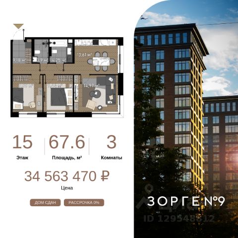 "Зорге 9" — готовые апартаменты бизнес-класса на Ходынке. 10 минут до Москва-Сити. Архитектура: 3 современных корпуса с фасадами в стиле архитектуры Нью-Йорка и с сервисами премиальных отелей, высотой до 23 этажа. Строгие линии, панорамные окна создают ощущение неподдельной роскоши и комфортной жизни в сердце мегаполиса. Проект награжден авторитетной премией European Property Awards. Резиденции: Свободная планировка, небольшая глубина этажа, огромные панорамные окна в пол до 3,6 м и высота потолков до от 3,3 до 4,3 м позволяют реализовать самые смелые концептуальные идеи и создать идеальный интерьер с учетом всех пожеланий. Вдохновляющие виды на город украсят ваш апартамент лучше любой картины. Есть возможность приобретения дизайн-проекта и полной меблировки апартаментов от партнеров девелопера. Расположение: 3 мин. пешком до парка Березовая роща 10 мин. пешком до Ходынского поля 10 мин. до ТЦ Авиапарк 30 минут до Шереметьево 10 мин до Москва-Сити или 1 станция до Москва-Сити 5 минут до ТТК 4 станции метро в шаговой доступности: 6 мин м. Полежаевская (фиолетовая ветка) 7 мин МЦК Зорге (МЦК) 7 мин м. Хорошевская (голубая ветка) 10 мин МЦК Хорошёво (МЦК) Благоустройство: Собственный парк 2 га с амфитеатром и поющими фонтанами. В парке высажено 136 деревьев и более 11 000 кустов и мелких растений из немецких питомников. Площадка для йоги и воркаут-зона со спортивными площадками. Теннисные столы и детский плейхаб Две башни Авторское гранд-лобби В лобби предусмотрена лаундж-зона, чайная с камином, комната для хранения велосипедов и колясок. Доступ по системе FACE ID. В отделке лобби и лифтовых холлов использован декоративный камень итальянского бренда Atlas Concorde Пентхаусы На верхнем уровне комплекса расположены роскошные просторные пентхаусы с высотой потолка до 4,2 метра и панорамными окнами до 3,6 метров, открывающими великолепные виды на столицу. Пентхаусы с выходами на собственные приватные террасы на кровле, площадью от 150 кв. м являются жильем high-уровня, демонстрирующим высокий статус владельца.