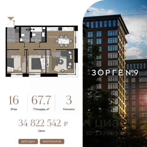 "Зорге 9" — готовые апартаменты бизнес-класса на Ходынке. 10 минут до Москва-Сити. Архитектура: 3 современных корпуса с фасадами в стиле архитектуры Нью-Йорка и с сервисами премиальных отелей, высотой до 23 этажа. Строгие линии, панорамные окна создают ощущение неподдельной роскоши и комфортной жизни в сердце мегаполиса. Проект награжден авторитетной премией European Property Awards. Резиденции: Свободная планировка, небольшая глубина этажа, огромные панорамные окна в пол до 3,6 м и высота потолков до от 3,3 до 4,3 м позволяют реализовать самые смелые концептуальные идеи и создать идеальный интерьер с учетом всех пожеланий. Вдохновляющие виды на город украсят ваш апартамент лучше любой картины. Есть возможность приобретения дизайн-проекта и полной меблировки апартаментов от партнеров девелопера. Расположение: 3 мин. пешком до парка Березовая роща 10 мин. пешком до Ходынского поля 10 мин. до ТЦ Авиапарк 30 минут до Шереметьево 10 мин до Москва-Сити или 1 станция до Москва-Сити 5 минут до ТТК 4 станции метро в шаговой доступности: 6 мин м. Полежаевская (фиолетовая ветка) 7 мин МЦК Зорге (МЦК) 7 мин м. Хорошевская (голубая ветка) 10 мин МЦК Хорошёво (МЦК) Благоустройство: Собственный парк 2 га с амфитеатром и поющими фонтанами. В парке высажено 136 деревьев и более 11 000 кустов и мелких растений из немецких питомников. Площадка для йоги и воркаут-зона со спортивными площадками. Теннисные столы и детский плейхаб Две башни Авторское гранд-лобби В лобби предусмотрена лаундж-зона, чайная с камином, комната для хранения велосипедов и колясок. Доступ по системе FACE ID. В отделке лобби и лифтовых холлов использован декоративный камень итальянского бренда Atlas Concorde Пентхаусы На верхнем уровне комплекса расположены роскошные просторные пентхаусы с высотой потолка до 4,2 метра и панорамными окнами до 3,6 метров, открывающими великолепные виды на столицу. Пентхаусы с выходами на собственные приватные террасы на кровле, площадью от 150 кв. м являются жильем high-уровня, демонстрирующим высокий статус владельца.