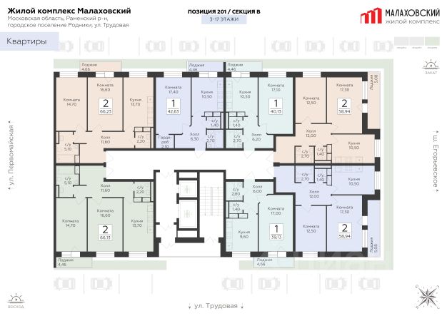Продается 3-к квартира площадью 91.56 кв. м с черновой отделкой. Квартира расположена на 16 этаже 17 этажного дома, в 203 корпусе. "Малаховский" - жилой комплекс в Раменском районе Подмосковья, идеально подходящий для семей с детьми. Проект от федерального застройщика ГК "Развитие" находится в тихом и зеленом микрорайоне Родники и отличается удобной транспортной связью с Москвой и Люберцами. Три дома высотой 17 этажей с видами на озеро и парк, просторные квартиры, приватный двор-патио с ландшафтным дизайном и доступная инфраструктура обеспечат жителям новых квартир все преимущества городской жизни в живописном природном окружении. Транспортная доступность - Удобный выезд на Егорьевское шоссе и строящуюся магистраль МЕТК (Москва - Егорьевск - Тума - Касимов); - 18 км от МКАД; - 5 мин. до МЦД-3 "Удельная"; - 29 мин. до метро "Лермонтовский проспект". Архитектура Дома отличаются высокой тепло- и шумоизоляцией, долговечностью, высоким уровнем энергоэффективности и современным внешним видом. Фасады выполнены в спокойной цветовой гамме. Из окон с широкоформатным остеклением открываются виды на березовую рощу, озеро и зеленые дворы. Логичным продолжением архитектуры становятся просторные входные группы, где продумано всё: витражное остекление, высокие потолки, дизайнерская отделка, два выхода на обе стороны дома, а также современные лифты (грузовой и пассажирский) и колясочные. Планировочные решения Планировки комплекса "Малаховский" функциональны и эргономичны, что упрощает зонирование и расстановку мебели. Квартиры оснащены гардеробными, лоджиями с панорамным остеклением, двумя санузлами (даже в однокомнатных) и просторными прихожими. Высота потолков - 2,7 м. Квартиры сдаются с отделкой white box, которая позволит воплотить индивидуальный дизайн-проект по своему вкусу. Доступны варианты отделки "под ключ" с применением лучших дизайнерских материалов. Благоустройство В жилом комплексе тщательно продумана концепция благоустройства. Через всю территорию тянутся живописные прогулочные бульвары с ландшафтным дизайном и всесезонным озеленением. Рядом обустроено 3 современных детских площадки с мягким покрытием, а для взрослых предусмотрены уютные лаунж-зоны для общения, тихого отдыха и спорта на свежем воздухе. Двор каждого дома свободен от машин, а для дополнительного уюта и безопасности здесь установлено современное освещение. Естественным продолжением дворового ландшафта становится березовая роща с природными тропинками и небольшим водоемом, прилегающая к жилому комплексу. Инфраструктура и окружение - Наземный паркинг на 55 машино-мест и гостевая парковка; - Все повседневные сервисы (кафе, магазины, салоны красоты) прямо в вашем доме; - Фитнес-клуб, бассейн, спортивные площадки и велодорожки в многочисленных парках микрорайона Родники; - 2 школы, гимназия и детский сад в шаговой доступности; - ТЦ "Родники" с рестораном и супермаркетом; - Петропавловский парк с благоустроенным детским городком и волейбольной площадк