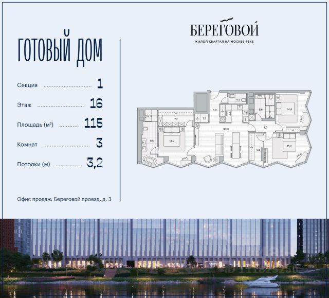 Продается 3-к квартира площадью 102.0 кв.м. на 16-м этаже в жилом комплексе премиум-класса River Park Кутузовский в Башне Lazur Tower О жилом комплексе. Премиальный жилой комплекс River Park Кутузовский строится в одном из самых престижных районов столицы Дорогомилово, на берегу Москвы-реки. Яркий проект в стиле эко-футуризма станет самым масштабным и самым высотным ЖК в локации Кутузовского проспекта. В проекте будет впервые воплощена концепция Family Premium. Расположение и Транспортная доступность: - На берегу Москвы-реки, напротив Москва-Сити - 600 метров до Кутузовского проспекта - Удобный съезд с ТТК - Прямой выезд на МКАД по Северному дублеру Кутузовского проспекта. - В пешей доступности 3 станции метро: Фили, Парк Победы, Кутузовская, а также станция МЦД Фили. Архитектура от именитого бюро ADM отличается уникальной пластикой фасадов - башни словно парят в воздухе, играя гранями как драгоценные камни. Жилой комплекс состоит из 5-ти небоскребов с home park на закрытой территории и внешней торговой галереей с открытым доступом. В закрытом внутреннем дворе уникальная по насыщенности клубная инфраструктура - 5 Towers Club только для жителей: - Многофункциональная спортивная площадка (баскетбол, футбол, воллейбол, большой теннис) - Детский игровой клуб NEMO - Life Rooms с караоке, барной стойкой и meeting room - Music salon - Gedonist Club с бильярдной - Beauty station - Гольф-симулятор Впервые в Москве lounge зоны на крыше небоскребов, только для жителей: - Всесезонные беседки иглу - Джакузи - Барная стойка - Грили - Площадка для занятий йогой - Самые высоки качели на крыше в России - Видовые площадки Благоустройство комплекса занимает 3 гектара и разработано мировым экспертом по городским парковым ландшафтам - голландским бюро WEST8. Концепция проекта дать жителям отдохнуть от городского ритма, расслабиться среди природы и натуральных материалов. В home park будут высажены многолетние деревья по принципу no allergy. - Зеркальный пруд с арт-объектом - Две детские площадки - Work out с навесом - Цветущий сад - Party lounge - Видовая зона отдыха с очагом - Солярий На территории жилого комплекса планируется строительство крупного образовательного центра: детский сад на 200 мест и школа на 460 мест.
