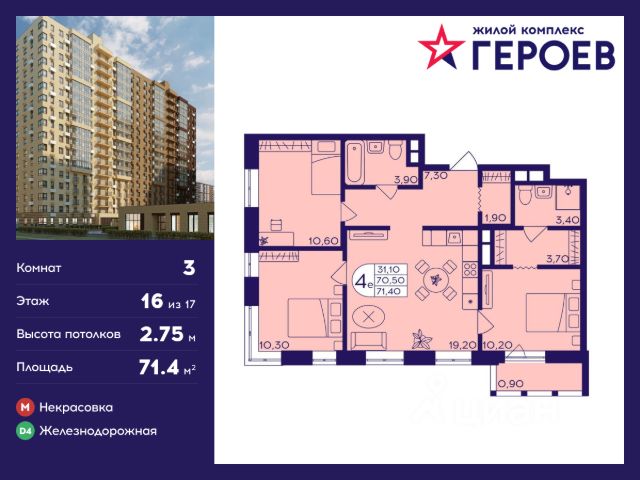 Продаётся 3-комнатная квартира 71.40 кв. м. в жилом комплексе "Героев" в Балашихе, Железнодорожный. Квартира расположена на 16 этаже 410 корпуса. В наличии квартиры с отделкой. Всего 40 минут до центра Москвы. При покупке квартиры в сданном доме ключи выдаются сразу! Жилой квартал "Героев" - это уютный проект для семей с детьми. В квартале созданы все условия для досуга всех возрастов: игровые и спортивные площадки, места для отдыха и прогулочные зоны. За 15 минут можно дойти от дома до Ольгинского лесопарка, популярного места для отдыха на свежем воздухе. На территории жилого комплекса уже открыт детский сад на 250 мест и началось строительство еще одного - для 220 малышей, а также школы для 1320 учеников. Рядом работают магазины, кафе, супермаркеты, пункты выдачи. Преимущества: • В уютных светлых квартирах с просторными кухнями-гостиными удобно встречать гостей и проводить время наедине друг с другом. • Благодаря увеличенному остеклению в комнатах много света. • Квартиры продаются с отделкой, можно заселяться сразу после получения ключей.