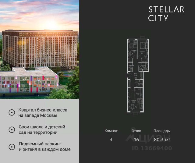 Продается квартира от надежного застройщика Tashir Estate в квартале бизнес-класса Stellar City в ЗАО Москвы. Площадь квартиры составляет: 72.6 кв. м, потолки: 3.1 м Квартира находится на 16 этаже, 4 корпуса жилого квартала Stellar City — микрогорода будущего на орбите Москвы. Stellar City — квартал в ЗАО Москвы вблизи инновационного центра Сколково. В окружении — 11 парков и природных зон, в том числе Долина реки Сетунь, Мещерский лес и парк развлечений The Rink. Город в городе Чтобы дом и инфраструктура вокруг отвечала динамичному лайфстайлу жителя мегаполиса, в основу проекта легла концепция город в городе, которая позволяет решать все бытовые вопросы in-home. В квартале будут возведены школа и детский сад, воркаут-зоны, променад, вело и беговые дорожки, детские площадки для каждого корпуса, а также коммерция на первых этажах для ежедневных покупок. Все необходимое — на расстоянии нескольких шагов. Изящные и лаконичные лобби Авторский дизайн, натуральные материалы в отделке и безупречный интерьер вне времени. Лобби и холлы в проекте бизнес-класса Stellar City ничем не отличаются от входных групп в премиум-сегменте благодаря качественным европейским материалам в отделке, стильному дизайну, консьерж-сервису и уютной зоне ожидания с журнальными столиками и мягкой мебелью. Комфорт и безопасность Закрытая территория, охрана, система СКУД, специально разработанное мобильное приложение дома для резидентов и подземный паркинг с круглосуточным наблюдением и доступом с помощью автоматического считывания номера авто.