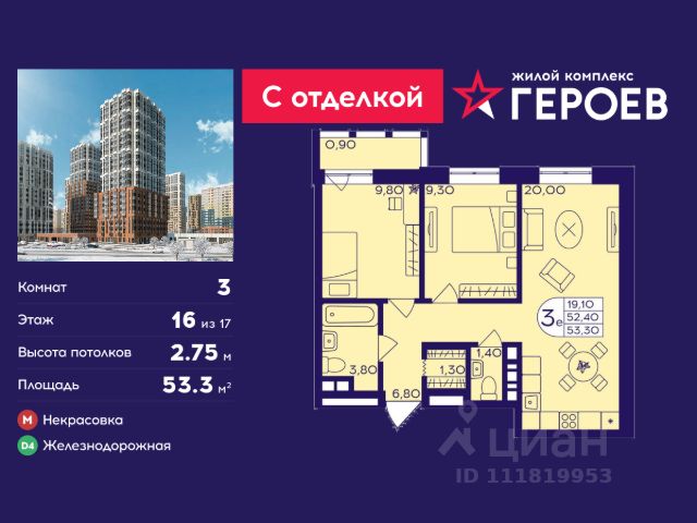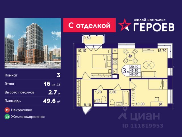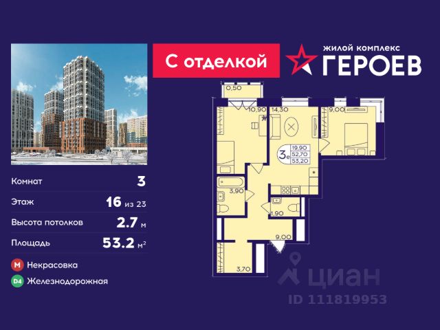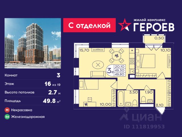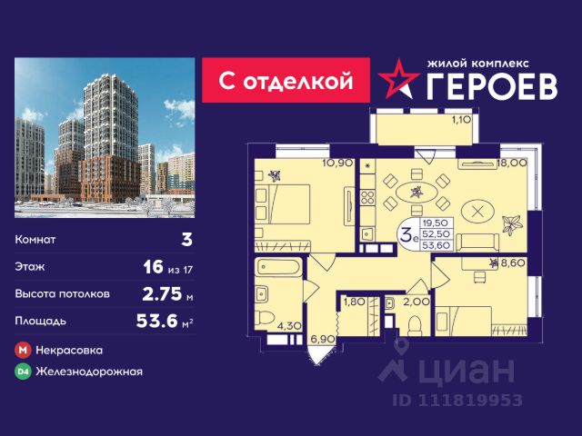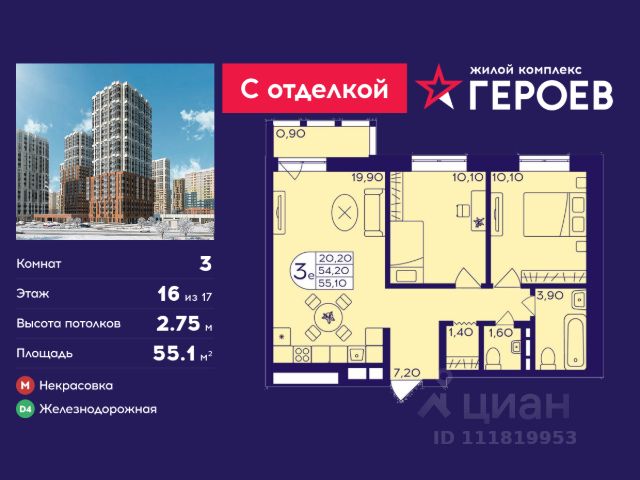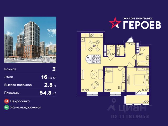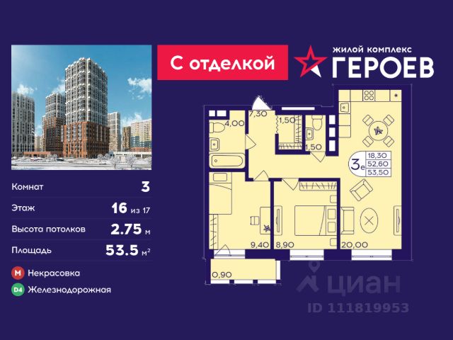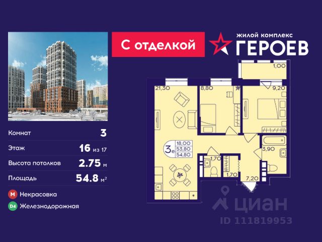 Продаётся 3-комнатная квартира 47.7 кв. м. в жилом комплексе "Героев" в Балашихе, Железнодорожный. Квартира расположена на 16 этаже 611 корпуса. Все квартиры представлены с чистовой отделкой. Вам не нужно тратить время и дополнительные финансы на ремонт или жить в шуме строительных работ - достаточно перевести свои вещи, расставить мебель и всё готово! Жилой квартал "Героев" - это уютный проект для семей с детьми. Всего 40 минут до центра Москвы. В квартале созданы все условия для досуга всех возрастов: игровые и спортивные площадки, места для отдыха и прогулок, магазины, кафе и пункты выдачи. За 15 минут можно дойти от дома до Ольгинского лесопарка - популярного места для прогулок и отдыха на свежем воздухе. Здесь приятно гулять всей семьёй, заниматься спортом или устроить пикник в выходной день. Преимущества: Квартира с готовой отделкой. Пространство полностью подготовлено для жизни: не нужно тратить время и деньги на ремонт или ждать его окончания. После получения ключей достаточно расставить мебель - и можно сразу заезжать и жить. Продуманные и светлые планировки. Просторные кухни-гостиные создают комфортное пространство для отдыха и встреч с близкими. В квартирах предусмотрены удобные гардеробные, благодаря чему легко поддерживать порядок и не перегружать комнаты шкафами. Увеличенное остекление. Большие окна наполняют квартиру естественным светом в течение всего дня, создавая ощущение простора и уюта, а также визуально расширяя пространство и делая интерьер более воздушным. Пешая доступность до станции Железнодорожная (МЦД-4) - дорога займёт не более 30 минут до центра Москвы: станции метро "Курская", "Площадь Ильича" или ТПУ Нижегородская.