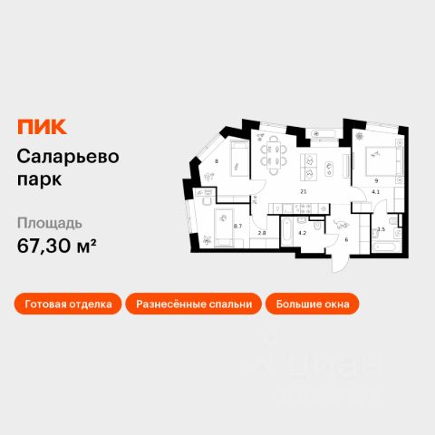 Продается трехкомнатная квартира без отделки в 9 фазе города-парка "Первый Московский". Общая площадь квартиры - 85,8 кв. м, этаж 16 из 19. Срок сдачи - 4 квартал 2026 года. Тип дома - монолитный. ТОЛЬКО ДО 28 ФЕВРАЛЯ: • Рассрочка до 13 месяцев с первоначальным взносом от 10% • Ежемесячный платеж от 50 000 руб. *подробную информацию по скидкам и акциям уточняйте в отделе продаж. Корпус состоит из 2х секций, без отделки. Город-парк "Первый Московский" расположен всего в 7 км по Киевскому шоссе от МКАД на территории Новой Москвы. Из города-парка прямой выезд на Киевское шоссе и трассу Солнцево-Бутово-Варшавское шоссе. ТРАНСПОРТНАЯ ДОСТУПНОСТЬ: - 5 мин. на личном автомобиле или 10 мин. на автобусе 189, 147, 193 до станции метро "Филатов Луг" - 5 мин. на личном автомобиле или 12 мин. на автобусе 863 до станции метро "Саларьево" - 6 мин. на личном автомобиле или 15 мин. на автобусе 333 до станции метро "Рассказовка" РАЗВИТАЯ ИНФРАСТРУКТУРА В ОКРУЖЕНИИ: - общеобразовательная школа 2120 корпуса д1, д7, ш1-ш5 - детский сад 2120 корпуса д2, д9 - школа искусств - городская больница, детская поликлиника, филиал 5 - подстанция скорой помощи 58 и пожарно-спасательный центр 313 - отдел полиции, отдел ГИБДД - торговые центры Столица и Новомосковский - стадион, каток, бассейн - кафе, продуктовые магазины, аптеки, фитнес центры, салоны красоты и пр. БЛАГОУСТРОЙСТВО: - детская площадка для малышей и детей до 12 лет - места отдыха для родителей в непосредственной близости - озеленение территории с учетом зонирования - максимальная близость корпуса к пару Филатов луг ОСОБЕННОСТИ АРХИТЕКТУРЫ: - безбарьерные входные группы - колясочные в каждой входной группе - коммерческие помещения на 1 этаже в двух секциях - кладовые помещения расположены на жилых этажах и на -1 этаже - в каждой секции корпуса по 3 лифта: 2 пассажирских, 1 грузовой - на фасадах предусмотрены корзины для установки внешних блоков кондиционеров - видеонаблюдение установленное в холлах первых этажей, у подъездов и прилегающей территории АВТОРСКИЙ ДИЗАЙН: Входные группы выполнены по авторскому дизайну, оснащены системой "тёплый пол". В каждой входной группе будет располагаться комфортабельная зона ожидания, почтовые ящики с ячейкой для спама, колясочная, акцентные пуфы и столик.