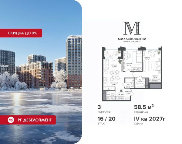 Скидка 9% при покупке квартиры! Продаётся 3-к квартира 63,5 кв.м. в ЖК "Михалковский" на 16-м этаже 18 этажного дома. Ипотека для каждого! Полная стоимость кредита от 13,192% до 17,149%. Ставка от 0,11% в АО "Альфа-Банк", ген. лицензия ЦБ РФ 1326 от 16.01.2015. Ставка фиксируется на первые 12 месяцев, далее полная стоимость кредита от 22,022% до 24,599% ставка 21,59%. Первоначальный взнос — от 20,1% от стоимости квартиры. Срок кредитования — от 4 до 30 лет. Компания "РГ-Девелопмент" предоставляет скидку на квартиры в жилом комплексе. Акция действительна до 15.03.2026 включительно. Для того чтобы воспользоваться предложением, необходимо подписать договор на приобретение недвижимости до 15.03.2026 включительно. Действует программа "Растет семья - растет и квартира". Компания "РГ-Девелопмент" вошла в ТОП-10 девелоперов по объёму введённого жилья в "Старой Москве" по итогам 2025 года. Прямая продажа от застройщика! Квартиры без отделки. Срок сдачи IV кв. 2027г. Особенности проекта: Завораживающие виды Красивое благоустройство Уникальная локация для Москвы (рядом Головинский парк, пруды, усадьба Михалково) Рядом с центром В проекте присутствует: архитектура голландского бюро MLA+, зеленые зоны, транспортная доступность, благоустроенная территория, подземный паркинг, детский сад и выход на Головинский парк с пятью прудами. Название комплекса указывает на одну из его черт - соседство с имением Михалково. Позвольте себе жить в месте, где проводили свой досуг династии Дашковых и Паниных.
