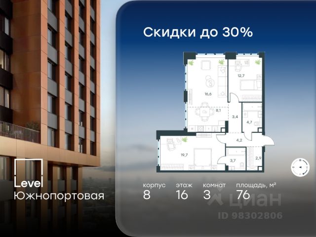 Цена указана с учётом скидки при 100%-й оплате, несубсидированной ипотеке, рассрочке (кроме программы "Рассрочка 0%"). В северной части района Печатники продается 3-комнатная квартира площадью 76.00 кв.м без отделки. Квартира расположена на 16 этаже 49-этажного корпуса 8 в жилом комплексе комфорт-класса Level Южнопортовая (компания Level Group/Левел групп). Отличная транспортная доступность: - 10 мин. пешком до станции метро "Кожуховская"; - 20 мин. пешком до станции МЦК "Дубровка"; - 3 мин. на авто до ТТК; - 13 мин. на авто до Садового кольца; - 15 мин. на авто до Бульварного кольца. Продуманный архитектурный проект: - авторская архитектура от бюро СПИЧ; - уникальные виды на реку, парки и достопримечательности города; - высота потолков в квартирах до 6 м; - окна высотой до 1,87 м с высоким коэффициентом сопротивления теплоотдаче. Расположение: Level Южнопортовая строится в северной части района Печатники - самой приближенной к центру. Здесь будет сформирован новый район "Южный порт", где построят крупный жилой и общественно-деловой центр, аналогичный Москва-Сити. В течение 10-12 лет в этом месте появятся не только жилые дома, но и развитая инфраструктура для жизни и работы. А еще совсем рядом находится набережная Москвы-реки, где планируется построить причалы для речных трамвайчиков и канатную дорогу. Уже сейчас вокруг жилого комплекса работают десятки магазинов и торговых центров, рядом расположено 6 парков, среди которых музей-заповедник "Коломенское". В 10 минутах пешком - 2 муниципальных и 2 частных детских сада, 7 общеобразовательных школ. Внутренняя инфраструктура: Для отдыха жителей в каждом корпусе предусмотрено лобби, оснащенное местами для отдыха, гостевыми санузлами и лапомойками, а в отдельных корпусах - камином. За счёт больших окон и высоких потолков пространства будут наполнены воздухом и светом. На первых этажах жилого комплекса откроются магазины, салоны красоты, фитнес-центр. Для детей строятся собственные детский сад и школа. Благоустройство: Внутренний двор комплекса разработан совместно с бюро GAFA. Основная идея - создать аналог Центрального парка в Нью-Йорке, гармонично сочетая высотные здания и большое изолированное парковое пространство. Вся площадь двора-парка будет огорожена и составит более 2 га, из которых 45% - озеленение. Одним из самых важных ландшафтных элементов здесь станет небольшая речка, наполняющаяся во время дождя. Вокруг неё появится сеть из островов, внутри которых расположатся тематические зоны спорта и отдыха. Технологии и инженерия: - автоматическая передача в управляющую компанию показаний квартирных счётчиков; - телефонная связь, телевидение и интернет на базе оптической мультисервисной сети; - гостевой Wi-Fi в лобби и на территории двора; - единый ключ доступа для входа на территорию комплекса.