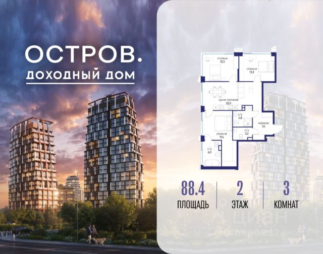 Продаётся 3-комн. квартира от застройщика: общая площадь 88.40 м², жилая 44.00 м², кухня 22.50 м², 2-й этаж, жилой квартал "Остров 14", корпус 6 (секция 1). Срок сдачи: 2 квартал 2029 года. 3 санузла (1 раздельный и 2 совмещенных). Остров.14 ДОХОДНЫЙ ДОМ - ЧАСТЬ ПРОЕКТА "ОСТРОВ", В 10 МИНУТАХ ОТ МОСКВА-СИТИ, В 15 МИНУТАХ ЕЗДЫ ОТ САДОВОГО КОЛЬЦА. Квартиры с отделкой и мебелью, и с управлением "под ключ" Постоянный доход для инвесторов, отельный сервис для арендаторов Востребованные для аренды планировки: студии, 1- и 2-комнатные квартиры 28-64 м2 Полная комплектация квартир: отделка, мебель, бытовая техника, кондиционеры Постоянный поток арендаторов - 10 минут от Москва-Сити, 5 минут от метро "Мневники", самодостаточная инфраструктура в квартале и собственная клубная инфраструктура в доме, спортивный, рекреационный и деловой кластеры на территории ОСТРОВА