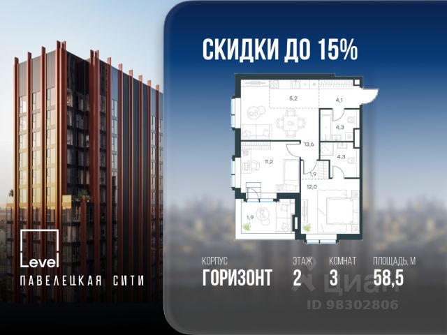 В Даниловском районе столицы (ЮАО) продаётся 3-комнатная квартира площадью 56.80 кв.м без отделки. Квартира расположена на 2 этаже 45-этажного корпуса 'Горизонт' в жилом комплексе бизнес-класса Павелецкая Сити. Высота потолков 3.00м. Престижная локация "Павелецкая Сити" - жилой комплекс бизнес-класса, расположенный в престижном Даниловском районе Москвы, на границе с ЦАО. Проект находится в историческом центре города в окружении парков, Москвы-реки и сформированной инфраструктуры. В пределах 20 минут пешком есть 3 станции метро, а в 5 минутах езды на авто - ТТК и Садовое кольцо. - 15 мин. пешком до метро "Павелецкая"; - 20 мин. пешком до станций "Тульская" и "Серпуховская"; - 8 мин. на авто до Кремля; - 10 мин. на авто до парка Горького и парка "Зарядье"; - 20 мин. на авто до башен "Москва-Сити". Авторская архитектура Архитектурная концепция разработана бюро СПИЧ по индивидуальному проекту. Облик корпусов I и II очередей отсылает к стилистике архитектуры классического Нью-Йорка и золотой эпохи Голливуда. Корпуса IV очереди вдохновлён эстетикой ар-деко в её современном переосмыслении. Благодаря линейному расположению корпусов из большинства квартир будут открываться потрясающие виды на исторический центр города и Москву-реку. Дизайнерские лобби Изысканные интерьеры лобби жилого комплекса отсылают к классическим фильмам золотой эпохи Голливуда. Классика в "Павелецкая Сити" - не имитация, а современное осмысление лучшего в этом стиле. В каждом вестибюле оборудованы стойки ресепшен, комфортные зоны ожидания, гостевые санузлы, мойки для лап животных, колясочные. В корпусах по 3-4 лифта, включая сервисный, с прямым доступом в паркинг. Площадь лобби - от 47,9 до 114,9 кв. м, высота потолков - до 5,46 м. Благоустройство и инфраструктура Для создания благоустройства было приглашено 2 ведущих бюро - ADM и GAFA. Разноуровневое пространство вмещает всё необходимое для качественного досуга: игровые площадки для детей всех возрастов, тропы здоровья для пеших прогулок, крытые аллеи с качелями, места для работы на свежем воздухе, многофункциональные спортивные площадки - воркаут-зоны, столы для пинг-понга, зоны командных игр. Общая площадь закрытого двора - 4,63 га. Комфорт - это когда рядом всё, что нужно для жизни. На первых этажах и в стилобатной части корпусов "Павелецкая Сити" размещены 85 коммерческих помещений, где откроются супермаркеты, кафе, пекарни, аптеки и другие службы сервиса. В составе проекта также предусмотрены собственный фитнес-клуб и развивающий центр Letovo Kids, а также школа на 720 мест и детский сад на 175 мест. Технологии и безопасность - Wi-Fi в лобби и на придомовой территории; - Автоматизированная система контроля и учета ресурсов; - Круглосуточное видеонаблюдение и охрана; - Круглосуточная связь с охраной через приложение, телефон или кол-центр; - Контроль доступа по биометрической системе Face-ID; - Усиленный сотовый сигнал в лифтах и паркинге; - Распознавание номеров автомобилей при въезде/выезде в/из паркинга.