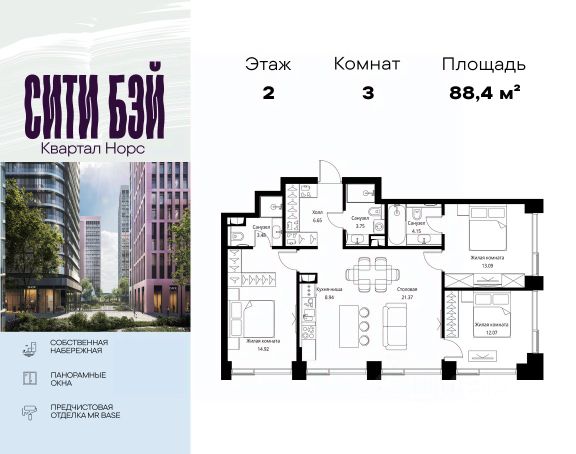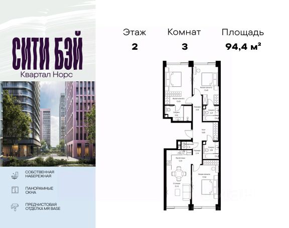Прямая продажа от застройщика. Продаётся 3-комнатная квартира общей площадью 79.40 м² с предчистовой отделкой в ЖК Сити Бэй, квартале Норс, на 2-м этаже 26 этажного дома. Концепция жилого комплекса Сити Бэй - настоящий город в городе с отлично развитой инфраструктурой и собственной благоустроенной набережной. На территории жилого комплекса расположено пять кварталов - Атлантик, Пасифик, Индиан, Норс, Клиф. Жилой квартал Сити Бэй отличается оригинальной концепцией и выделяется среди других проектов такими характеристиками как: - Архитектура, - Виды из окон, - Природное окружение, вызывая гордость у жителей и восхищение у прохожих. Вся жизнь района Покровское-Стрешнево строится вокруг водных объектов: - Пойма реки Сходни с уникальной экосистемой, - Речка Химка и Химкинское водохранилище, - Москва-река, - Канал имени Москвы. Кругом вода, и местные с удовольствием этим пользуются. А сразу за рекой - центр водного спорта в Строгино с вейк-парком и яхт-клубами. Помимо воды, здесь очень много зелени: - Рядом Сходненский ковш памятник природы, естественный амфитеатр глубиной 40 метров; - Парк при усадьбе Братцево с фруктовым садом; - Дубовая роща "Маяк", - Алешкинский лес; - Лесопарк Покровское-Стрешнево с пляжами и бобрами. Главные транспортные артерии района: - Волоколамское шоссе, - Таганско-Краснопресненская линия метро и МЦД-2. Всего за 20 минут можно добраться до центра на машине или метро, а МЦД связывает ЖК Сити Бэй с северными, восточными и юго-восточными районами. Компания MR предлагает своим клиентам специальные условия приобретения квартир в рамках программ ипотечного кредитования от банков-партнеров.