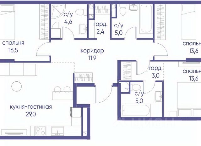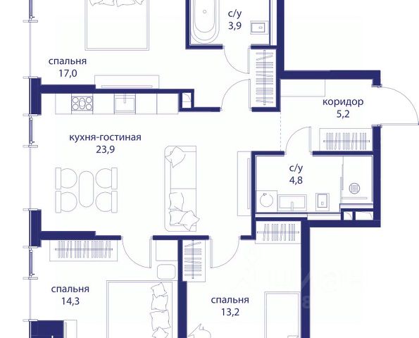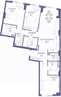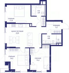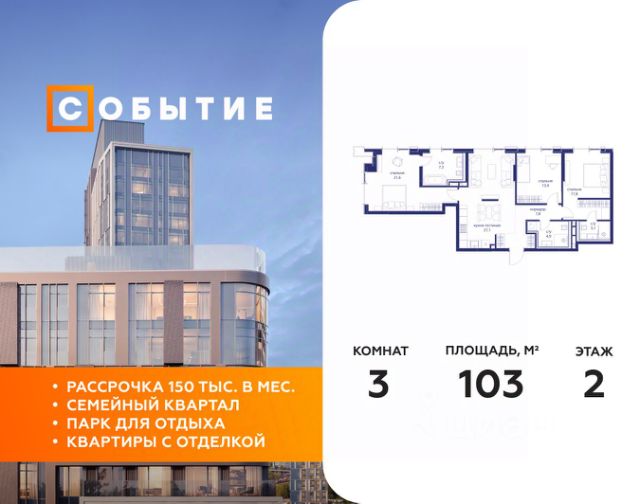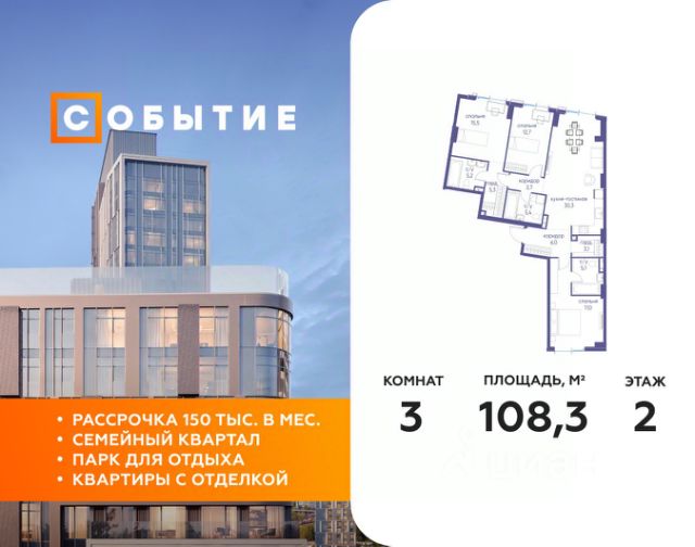 В продаже 3-к квартира от застройщика. Общая площадь 80.40, жилая 43.00, кухня 21. Квартира расположена на 2 этаже жилого квартала "Событие-6", корпус 2, 3. Квартира без отделки. Срок сдачи: 4 кв. 2029 года. СОБЫТИЕ.6 — финальный дом парк-квартала СОБЫТИЕ на Мосфильмовской. Переезжайте в уже сформированный квартал с готовой инфраструктурой и парком! Премиальный жилой комплекс в престижном районе Москвы предлагает стильную архитектуру, продуманное благоустройство и великолепно разнообразие общественных пространств. Свой парк прямо возле дома! Архитектура Архитектура СОБЫТИЯ.6 выполнена в ультрасовременном стиле московским бюро Atrium на основе дизайн-кода британских архитекторов LDA Design и UHA London. Дом отличает оригинальная геометрия фасадов, большое остекление и высокие лобби (до 6,2 м) с авторской мебелью и светильниками. Расположение Мосфильмовская улица (Раменки) — один из престижных районов Москвы. Близость к историческому и деловому центру, природным зонам Запада столицы. Транспортная доступность: • 10 мин до Москва-Сити и ТТК; • 15 мин до Садового кольца; • 25 мин до аэропорта Внуково; • 7-10 мин до станций метро "Аминьевская" и "Мичуринский проспект". Инфраструктура: • парк "Событие" (12 га, финалист конкурса Правительства Москвы) с беговыми (1,5 км) и велодорожками (2,7 км), экотропой (1,6 км), площадками, лекторием; • школа, детский сад, магазины, салоны красоты, рестораны (к моменту заселения); • мультидвор с игровыми и спортивными площадками, мини-бульваром; • общественная терраса на 10-м этаже (коворкинг, лаунж); • Закрытые общественные пространства: детская комната, спортивный зал, коворкинг, лаунж-зоны. Паркинг 256 мест для жителей (48 — для электромобилей), 24 гостевых (5 — для электромобилей), мойки колес, кладовые, зоны для велосипедов. Окружение Парки и заповедники (Воробьёвы горы, Матвеевский лес и др.), МГУ, театр им. Н. И. Сац, стадион "Лужники". Безопасность Видеонаблюдение, контроль доступа, видеодомофоны, консьерж-сервис 24/7, системы пожарной безопасности и мультисервисная оптическая сеть.