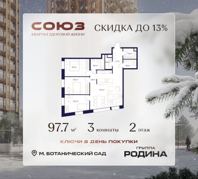 Готовые дома и ключи в день покупки Рассрочка 0% Продаётся 3-комнатная квартира площадью 97.7 м² на 2 этаже в Жилом Комплексе "Союз". Квартал здоровой жизни премиум-класса с рекордным количеством олимпийских видов спорта: - Ледовая арена для хоккея и фигурного катания, - Футбольные поля для тренировок, - Спортивный зал для фехтования, - Бассейн на 6 дорожек, - Центр единоборств, - 4 крытых площадки для настольного тенниса, - 7 теннисных кортов (крытых и открытых), - 4 крытых площадки для сквоша, - Легкоатлетический стадион, - Площадки для баскетбола и волейбола. Уникальные форматы квартир с мастер-спальнями, приватными террасами, балконами, а также пентхаусы с открыточными видами на город. Все квартиры продаются с отделкой Shell&Core и панорамным остеклением. Расположение Пешком: - 2 мин. до парка "Сад Будущего"; - 6 мин. до ст. м. "Ботанический сад"; - 6 мин. до ст. МЦК "Ботанический сад"; - 6 мин. до парка "Леоновская роща"; На автомобиле: - 2 мин. до СВХ (МСД); - 5 мин. до Проспекта Мира; - 10 мин. до ТТК; - 15 мин. до Садового кольца; - 25 мин. до аэропорта "Шереметьево". Благоустройство - собственная спортивная инфраструктура 7 Га; - зона для пикников; - игровые и спортивные площадки для детей всех возрастов; - розарий, а также сосновые, каштановые и дубовые аллеи; - площадки под открытым небом для занятий спортом и йоги; - игровые комнаты для детей; - лаунж-зона для резидентов; - просторная переговорная для деловых встреч; - премиальный ресторан "Шабада" Сосо Павлиашвили с водными арт-объектами на прогулочной аллее, садом ароматных трав и сценой под открытым небом; - кафе, химчистки, аптеки и супермаркеты рядом с домом. Окружение - 8 парков: Сад Будущего, Леоновская роща, Хуамин, Главный ботанический сад РАН, Шереметьевская дубрава, Останкино, парк спорта "Яуза", пойма реки Яуза и музей-усадьба "Останкино"; - 3 ВУЗа: ВГИК, РГСУ, МГПУ; - 12 школ, в том числе: школа 1499 им. И.А. Докукина (топ 100), Brookes Moscow, IThub школа; - 18 детских садов, в том числе билингвальный ALERTUM KIDS; - один из крупнейших океанариумов Европы "Москвариум"; - один из крупнейших в Европе торгово-развлекательных центров "Европолис".