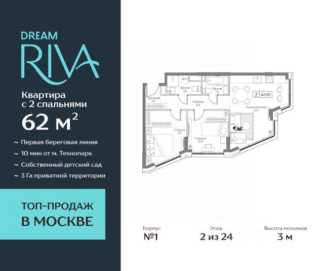 Увеличенный объем панорамного остекления создает неповторимое ощущения воздушности пространства! Двор-набережная с видами на гладь реки и кроны деревьев. Премиальный квартал DREAM RIVA — авторская архитектура в курортной концепции, воплощающей силу природных стихий в каждой детали оформления и благоустройства. Продаётся Квартира с 2 спальнями квартира на 2 этаже 24-этажного дома (1 корпус). Общая площадь: 62 кв.м. Высота потолков от 3 м. Формат приватного досуга и эксклюзивные привилегии в DREAM RIVA с приоритетным доступом для резидентов: - Первая линия Москвы-реки с открытыми видами на воду и город; - 3 Га приватного прибрежного парка с зонами для спорта и йоги; - Открытый солярий; - Школа и собственный детский сад; - Многофункциональные детские игровые площадки и детское кафе с игровой комнатой; - Клубная гостиная и lounge-бар. Локация вне конкуренции — инфраструктура полуострова предлагает всё, что нужно для размеренной жизни, работы, отдыха и развлечений: - Благоустроенная набережная с гастрогалереей; - Парк аттракционов Остров Мечты (в торговой части: рестораны, кафе, супермаркет, магазины, салон красоты, йога-студия и многое другое); - 44 Га ландшафтных парков для прогулок, спорта, пикников; - Пляжный комплекс Dream Beach Club со множеством бассейнов, ресторанов, баров и развлечений для любого возраста; - Яхт-клуб; - Вейк-парк; - Кинотеатр под открытым небом и многое другое. Удобная транспортная доступность: - Центр рядом: 15 минут до Садового кольца на авто, 20 минут до Сити или Кремля; - В 5 минутах прогулочным шагом — станция метро "Технопарк"; - Южный речной вокзал. Наши менеджеры будут рады провести для Вас консультацию и подробнее рассказать о проекте. Успейте купить на лучших условиях!