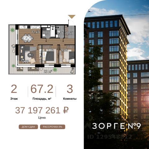 "Зорге 9" — готовые апартаменты бизнес-класса на Ходынке. 10 минут до Москва-Сити. Архитектура: 3 современных корпуса с фасадами в стиле архитектуры Нью-Йорка и с сервисами премиальных отелей, высотой до 23 этажа. Строгие линии, панорамные окна создают ощущение неподдельной роскоши и комфортной жизни в сердце мегаполиса. Проект награжден авторитетной премией European Property Awards. Резиденции: Свободная планировка, небольшая глубина этажа, огромные панорамные окна в пол до 3,6 м и высота потолков до от 3,3 до 4,3 м позволяют реализовать самые смелые концептуальные идеи и создать идеальный интерьер с учетом всех пожеланий. Вдохновляющие виды на город украсят ваш апартамент лучше любой картины. Есть возможность приобретения дизайн-проекта и полной меблировки апартаментов от партнеров девелопера. Расположение: 3 мин. пешком до парка Березовая роща 10 мин. пешком до Ходынского поля 10 мин. до ТЦ Авиапарк 30 минут до Шереметьево 10 мин до Москва-Сити или 1 станция до Москва-Сити 5 минут до ТТК 4 станции метро в шаговой доступности: 6 мин м. Полежаевская (фиолетовая ветка) 7 мин МЦК Зорге (МЦК) 7 мин м. Хорошевская (голубая ветка) 10 мин МЦК Хорошёво (МЦК) Благоустройство: Собственный парк 2 га с амфитеатром и поющими фонтанами. В парке высажено 136 деревьев и более 11 000 кустов и мелких растений из немецких питомников. Площадка для йоги и воркаут-зона со спортивными площадками. Теннисные столы и детский плейхаб Две башни Авторское гранд-лобби В лобби предусмотрена лаундж-зона, чайная с камином, комната для хранения велосипедов и колясок. Доступ по системе FACE ID. В отделке лобби и лифтовых холлов использован декоративный камень итальянского бренда Atlas Concorde Пентхаусы На верхнем уровне комплекса расположены роскошные просторные пентхаусы с высотой потолка до 4,2 метра и панорамными окнами до 3,6 метров, открывающими великолепные виды на столицу. Пентхаусы с выходами на собственные приватные террасы на кровле, площадью от 150 кв. м являются жильем high-уровня, демонстрирующим высокий статус владельца.