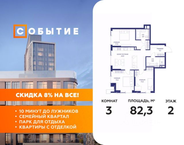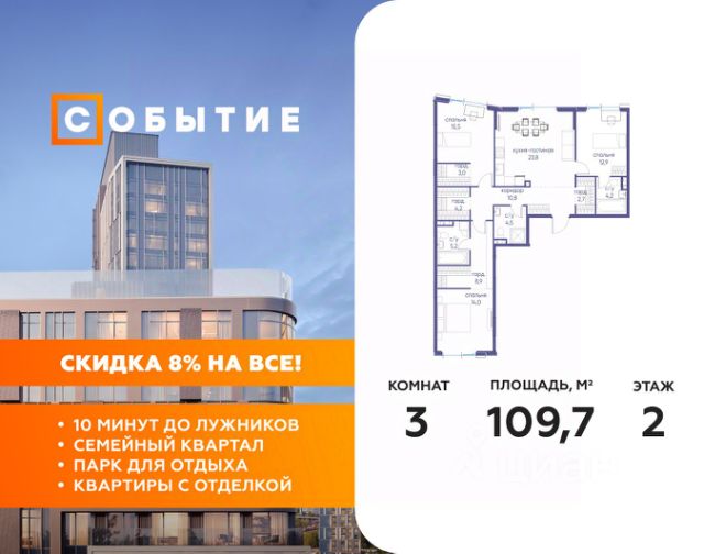 7 дней до окончания акции "Скидка 8%" Весь март - скидка до 8% действует до 31.03.2026 г. при 100% оплате и не субсидированной ипотеке! В продаже 3-к квартира от застройщика. Общая площадь 80.40, жилая 43.00, кухня 21. Квартира расположена на 2 этаже жилого квартала "Событие-6", корпус 2, Секция 3. Квартира без отделки. Срок сдачи: 4 кв. 2029 года. СОБЫТИЕ.6 — финальный дом парк-квартала СОБЫТИЕ на Мосфильмовской. Переезжайте в уже сформированный квартал с готовой инфраструктурой и парком! Премиальный жилой комплекс в престижном районе Москвы предлагает стильную архитектуру, продуманное благоустройство и великолепно разнообразие общественных пространств. Свой парк прямо возле дома! Архитектура Архитектура СОБЫТИЯ.6 выполнена в ультрасовременном стиле московским бюро Atrium на основе дизайн-кода британских архитекторов LDA Design и UHA London. Дом отличает оригинальная геометрия фасадов, большое остекление и высокие лобби (до 6,2 м) с авторской мебелью и светильниками. Расположение Мосфильмовская улица (Раменки) — один из престижных районов Москвы. Близость к историческому и деловому центру, природным зонам Запада столицы. Транспортная доступность: • 10 мин до Москва-Сити и ТТК; • 15 мин до Садового кольца; • 25 мин до аэропорта Внуково; • 7-10 мин до станций метро "Аминьевская" и "Мичуринский проспект". Инфраструктура: • парк "Событие" (12 га, финалист конкурса Правительства Москвы) с беговыми (1,5 км) и велодорожками (2,7 км), экотропой (1,6 км), площадками, лекторием; • школа, детский сад, магазины, салоны красоты, рестораны (к моменту заселения); • мультидвор с игровыми и спортивными площадками, мини-бульваром; • общественная терраса на 10-м этаже (коворкинг, лаунж); • Закрытые общественные пространства: детская комната, спортивный зал, коворкинг, лаунж-зоны. Паркинг 256 мест для жителей (48 — для электромобилей), 24 гостевых (5 — для электромобилей), мойки колес, кладовые, зоны для велосипедов. Окружение Парки и заповедники (Воробьёвы горы, Матвеевский лес и др.), МГУ, театр им. Н. И. Сац, стадион "Лужники". Безопасность Видеонаблюдение, контроль доступа, видеодомофоны, консьерж-сервис 24/7, системы пожарной безопасности и мультисервисная оптическая сеть.