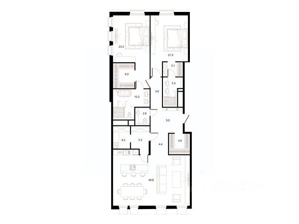 Просторная квартира с тремя мастер-спальнями, панорамными окнами на две стороны света, возможностью выйти на балкон из каждой комнаты и кухни-гостинной.