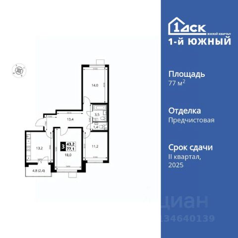 Прямая продажа от застройщика! Жилой Комплекс класса Комфорт Плюс. Продаётся 3-к квартира номер 109 общей площадью 77.1 кв.м. на 4-м этаже 24 этажного здания. Отделка Whitebox. Цена с учётом скидки. Особенности квартиры: - МЦД-5 в пешей доступности - Квартал с южным садом - Свои 3 детских сада и 2 большие школы - Просторная спальня, в которой можно разместить большую кровать. - Распашная планировка - отличное сочетание удобства и свободы. - Гостевой санузел - комфорт и удобство для ваших гостей. - Просторная кухня - место для семейных ужинов и кулинарных экспериментов. - Просторная мягкая зона - комфорт и уют для отдыха всей семьи. - Возможность добавить спальное место - дополнительный комфорт для гостей. - Ниша под шкаф - компактное и удобное место для вещей. - Просторная лоджия - идеальное место для уютных вечеров. Квартира с предчистовой отделкой (White box). Вам не придется заниматься черновыми и трудоёмкими работы, а чистовую отделку и дизайн - сделайте на свой вкус. Информация о комплексе: Одно из преимуществ проектов 1- ДСК большие застекленные лоджии. Другое преимущество честный евро-формат. Во всем проекте предусмотрена система Умный дом. В состав устанавливаемого пакета устройств входит: WiFi реле для управления группами потребителей, беспроводной кран перекрытия с эл. приводом, беспроводной сенсор протечки, Яндекс Станция Мини. Его расположение можно назвать удачным за счет транспортной доступности и близости к природным объектам. По соседству лес, а в каждом дворе плодовые деревья. Весной квартал окутывает бело-розовое облако: это цветут яблони, груши, сливы. К августу в воздух наполняется ароматом созревших плодов. Зимой среди покрытых инеем деревьев протянулась лыжня. Транспортная доступность: - Общественный транспорт: Действующая ж/д станция Булатниково (в перспективе будущая МДЦ D5) в пешей доступности, всего 10-12 минут. - Личный автотранспорт: Удобный выезд на трассу М4-Дон в сторону Москвы и области 850 м, до МКАД - 1 км Внутренняя инфраструктура: Красивые продуманные подъезды - еще одно преимущество проекта 1-й Южный. Вход в сквозные подъезды есть и с улицы, и со двора. Благодаря сплошному остеклению в них всегда светло и уютно. Подъезды расположены на уровне земли, поэтому и молодым родителям с коляской, и жильцам с ограниченными возможностями вход и выход неудобств не доставят. В помещении предусмотрено место под стойку ресепшен с выводом инженерных сетей. Если жильцы решат на общем собрании, что необходим охранник или консьерж, организовать для них рабочее место можно быстро и с минимальными затратами. В подъездах предусмотрены уборные для детей и взрослых. Колясочные в каждом подъезде позволяют поддерживать порядок и чистоту на этажах. На случай прогулки с четвероногим питомцем в непогоду в подъездах устроены лапомойки. Во дворах и на общественных территориях 1-ого Южного столько всего интересного для юных обитателей. Собственные 3 детских сада и 2 больших школы буквально под ок