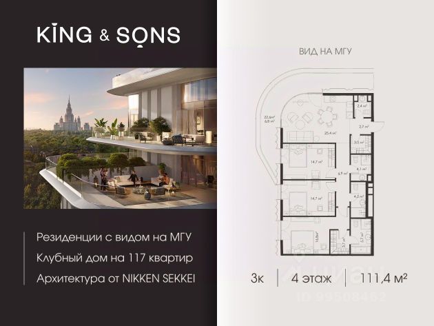 Продается 3-комнатная квартира 145,3м² с авторским ремонтом на 4 этаже 17-этажного монолитного дома в ЖК Dominion (корпус 2).