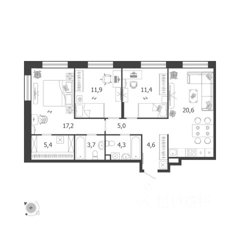 Гостиная: 21,4 м². Просторная гостиная, где можно разместить диван, телевизор и другие элементы интерьера.
