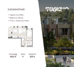 В жилом кластере Родина Парк рядом с природным заказником Долина реки Сетунь продаётся 3-комнатная квартира. Продуманная европланировка, которую легко зонировать под ваши запросы. Потолки от 3,1 м. "Родина Парк" — премиальный семейный кластер с образовательным медиакластером, строящийся на западе Москвы в окружении природного заповедника "Долина реки Сетуни". • Скидки недели на избранный пул лотов • Рассрочка 0% на выгодных условиях до 2 лет • Семейная ипотека, подбор комбо-вариантов ипотечных программ прямо в офисе продаж • Скидки 8% при 100% оплате или ипотеке. ЛОКАЦИЯ: 8 минут пешком до станции БКЛ "Давыдково". 12 минут на автомобиле до Нового Арбата. Удобные выезды на Кутузовский проспект, Аминьевское шоссе. ИНФРАСТРУКТУРА И СЕРВИСЫ ДЛЯ ЖИТЕЛЕЙ - Уникальная экосистема для развития, здоровья и творчества на территории 3,5 Га: - Первый в России образовательный медиакластер (с участием Русской медиагруппы) для творческого развития детей и взрослых с возможностью получить востребованную профессию в сфере шоу-бизнеса. - Инфраструктура и сервисы для семей с детьми на территории жилого кластера (частный детский сад, детские игровые пространства, творческие студии для занятий музыкой и танцами, безопасная и комфортная среда для детей и родителей), событийно-культурная площадка для проведения семейного досуга); - Здоровая среда (биохакинг-центр, фитнес-зал и спортивная инфраструктура во дворе, медитационные пространства, инженерные решения для освещения, свежего воздуха и очистки воды, сервисы красоты и поддержания активного долголетия); - Сервисы заботы (инфраструктура комфорта - подземный паркинг, кладовые, колясочные, консьерж- сервис, умный дом, мобильное приложение, профессиональная управляющая компания, сервисы охраны и обеспечение абсолютной безопасности) - Комьюнити резидентов (социальные пространства для дружеского и делового общения - летний атриум с уличным кинотеатром, зоны отдыха, кафе и рестораны, комьюнити-сервис с культурно- событийной программой в медиакластере); - Модуль благосостояния (комфортные пространства для работы и саморазвития - коворкинги и переговорные). ИНФРАСТРУКТУРА РАЙОНА: Насыщенная образовательная среда: филиалы МГИМО, МГУ, МГТУ, Сколково. Топовые школы: 6 лучших частных школ Москвы и области (Forbes) в 10 минутах езды. Природное окружение для пеших прогулок, спорта и отдыха. "Родина Парк" — это место, где растут и дети, и ваши возможности. Экосистема, где всё подчинено развитию — физически, профессионально, творчески.
