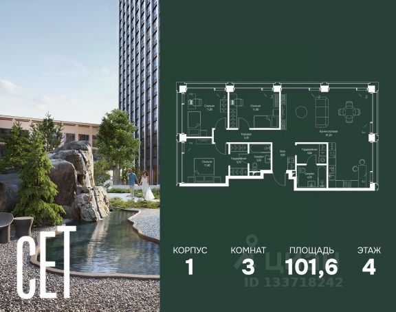 Прямая продажа от застройщика. В ЖК Сет продается 3-комнатная квартира площадью 101.60 м², расположенная в корпусе 1, на 4 этаже 18 этажного дома. Сет имеет стратегически выгодное расположение в ЗАО, в районе с большой историей и блестящим будущим: между природной зоной долины реки Сетунь и Кутузовским проспектом. В рамках возведения первой очереди предусмотрено три корпуса высотой 18, 45 и 59 этажей. На верхних этажах спроектированы общедоступные смотровые площадки с панорамным обзором на центр столицы. Преимущества проекта: • Функциональные планировочные решения • Контроль проникновения через входную дверь • Система управления освещением и температурой в квартире • Система защиты от протечек с функцией перекрытия воды • Вход в подъезд по биометрическим считывателям Face ID • Скоростные лифты • Двухуровневый подземный охраняемый паркинг на 495 машино-мест Застройка Сет включает в себя не только жилые корпуса, но и инфраструктурные объекты. Все необходимое для повседневного комфорта будет расположено в шаговой доступности: • Фитнес-Клуб с бассейном • Ведущая городская школа, детский сад и школа искусств • Центр культуры и досуга • Медицинский центр • Кафе и рестораны Расположение комплекса: Пешком: • Метро "Давыдково" - 17 минут • Парк "Долина реки Сетунь" - 3 минуты • Открытие новых станций метро в шаговой доступности в будущем Инфраструктура: Разнообразить свой день резиденты Веер смогут также проводя больше времени на свежем воздухе. Двор разделен на 4 зоны разных эмоций и действий, которые пересечены и соединены веерными прогулочными маршрутами: • Спортивная площадка устроена в глубине "Кленовой рощи" • В "Чайном домике" будет создан навес с утеплением для отдыха в любую погоду • Площадки для детей воплотятся в "Волшебный лес" с цветами, зеркалами и световым дизайном • "Центральная площадь" устроена у водного оазиса живописного пруда. На машине: • "Москва-Сити" - 15 минут • Садовое кольцо - 20 минут • ТЦ "Океания" - 8 минут • ТЦ "Времена года" - 13 минут • Сколково - 12 минут • Гребной канал - 17 минут Компания MR предлагает своим клиентам специальные условия приобретения квартир в рамках программ ипотечного кредитования от банков-партнеров.