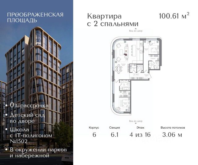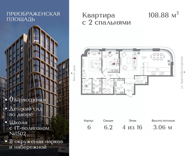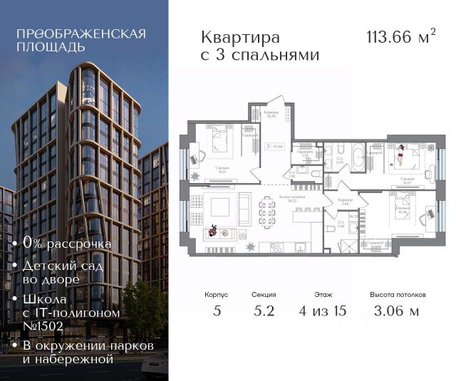 Рассрочка 0% от застройщика. Первоначальный взнос от 20%. Предложение действует до 31 января 2026 года Квартира на 4 этаже в жилом комплексе премиум-класса "Преображенская площадь". Общая площадь: 105.72 кв.м. Проект премиум-класса в историческом районе Москвы. До метро "Преображенская площадь" 3 минуты пешком. Квартиры сдаются без отделки и в свободной планировке, чтобы жители могли оформить пространство с учетом своей индивидуальности. Высота потолков от 3,15м, широкоформатное остекление, 3-5 квартир на этаже. Система Умный дом. Дизайнерские лобби. Внутренний двор 1,5 га функциональное и безопасное пространство для игр, работы и занятий спортом. Пешеходный променад для прогулок. Дома переменной этажности. Есть подземный паркинг. Жилой комлекс находится в окружении парков Сокольники, Черкизовский, Измайловский, заповедника Лосиный остров и ВДНХ, а также вблизи пешеходной набережной. Комфортная удаленность от центра: 7 минут на автомобиле до ТТК, 8 минут до Садового кольца, 25 минут до Кремля.