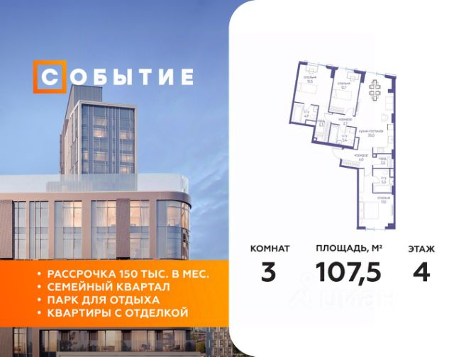 В продаже 3-к квартира от застройщика. Общая площадь 107.50, жилая 45.20, кухня 29.5. Квартира расположена на 4 этаже жилого квартала "Событие-6", корпус 2, 5. Квартира без отделки. Срок сдачи: 4 кв. 2029 года. СОБЫТИЕ.6 — финальный дом парк-квартала СОБЫТИЕ на Мосфильмовской. Переезжайте в уже сформированный квартал с готовой инфраструктурой и парком! Премиальный жилой комплекс в престижном районе Москвы предлагает стильную архитектуру, продуманное благоустройство и великолепно разнообразие общественных пространств. Свой парк прямо возле дома! Архитектура Архитектура СОБЫТИЯ.6 выполнена в ультрасовременном стиле московским бюро Atrium на основе дизайн-кода британских архитекторов LDA Design и UHA London. Дом отличает оригинальная геометрия фасадов, большое остекление и высокие лобби (до 6,2 м) с авторской мебелью и светильниками. Расположение Мосфильмовская улица (Раменки) — один из престижных районов Москвы. Близость к историческому и деловому центру, природным зонам Запада столицы. Транспортная доступность: • 10 мин до Москва-Сити и ТТК; • 15 мин до Садового кольца; • 25 мин до аэропорта Внуково; • 7-10 мин до станций метро "Аминьевская" и "Мичуринский проспект". Инфраструктура: • парк "Событие" (12 га, финалист конкурса Правительства Москвы) с беговыми (1,5 км) и велодорожками (2,7 км), экотропой (1,6 км), площадками, лекторием; • школа, детский сад, магазины, салоны красоты, рестораны (к моменту заселения); • мультидвор с игровыми и спортивными площадками, мини-бульваром; • общественная терраса на 10-м этаже (коворкинг, лаунж); • Закрытые общественные пространства: детская комната, спортивный зал, коворкинг, лаунж-зоны. Паркинг 256 мест для жителей (48 — для электромобилей), 24 гостевых (5 — для электромобилей), мойки колес, кладовые, зоны для велосипедов. Окружение Парки и заповедники (Воробьёвы горы, Матвеевский лес и др.), МГУ, театр им. Н. И. Сац, стадион "Лужники". Безопасность Видеонаблюдение, контроль доступа, видеодомофоны, консьерж-сервис 24/7, системы пожарной безопасности и мультисервисная оптическая сеть.