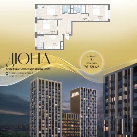 Продаётся 3-комнатная квартира в строящемся доме (Корпус 3), срок сдачи: II-кв. 2028, общей площадью 76.59 кв.м., на 5 этаже. Многоквартирный жилой комплекс с подземной автостоянкой и встроенно-пристроенным ДОУ на 120 мест по адресу: Московская область, г.о. Котельники, Новорязанское шоссе, вл. 6, комплекс 1