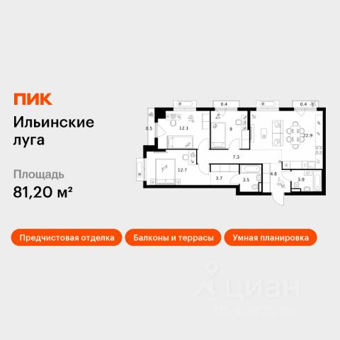 Продаётся 3-комн. квартира площадью 81,2 кв.м на 5 этаже 9 этажного дома (Корпус 4.3, Секция 5) проекта ПИК Ильинские луга. Светлый просторный подъезд на уровне земли, функциональная планировка, большие окна, предчистовая отделка. Жилой район "Ильинские луга" находится в 10 километрах от МКАД по Новорижскому шоссе, в 20 минутах на автомобиле от станций метро "Волоколамская", "Тушинская" и "Строгино". В будущем ближе к проекту, в 9 минутах пути на машине, откроется станция "Ильинская" Рублёво-Архангельской линии, которая будет соединять Арбатско-Покровскую линию и Большую кольцевую линию. Сейчас в квартале начались продажи в корпусах 3.2, 3.3, 3.4, 3.5 и 3.6. "Ильинские луга" — масштабный проект, в который входит девять детских садов, четыре школы и поликлиника. Он строится в престижном и экологичном районе среди лесов и памятников природы. За 5 минут от жилого квартала можно доехать до Рублёво-Успенского шоссе, а за 30 минут — до центра Москвы. До крупного торгового центра "РИГАМОЛЛ" всего 5 минут на автомобиле, а до ТЦ "Твой дом" и гипермаркета "Глобус" — 10 минут. В "Ильинских лугах" строятся только девятиэтажные дома — такая архитектура соответствует спокойной жизни за городом. В каждом дворе-парке есть места для отдыха, детские и спортивные площадки. А ещё, здесь уже открыт большой PlayHub "Гравити" — современное игровое пространство с космической тематикой, холмами, зонами для игр и отдыха жителей любого возраста. На первых этажах уже работают магазины, кафе и пекарни. Места для отдыха от "Ильинских лугов" тоже недалеко: 10 минут на машине — и вы в музее-усадьбе "Архангельское". Также рядом находится Лохин остров — памятник природы, где водятся речные черепахи, есть места для кемпинга и возможность сплавиться по реке. Артикул 1012258 (Застройщик ООО "СЗ "ГРАДОЛИМП")