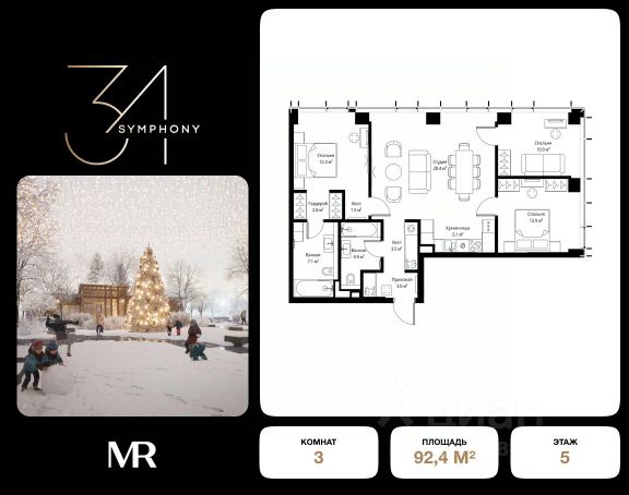 Дом сдан. Ключи в день покупки! В продаже 3-комнатная квартира площадью 92.40 м² с предчистовой отделкой на 5 этаже 43 этажного дома в корпусе Сильвер. ЖК Симфония 34 - концептуально новый жилой комплекс премиум-класса с подземной парковкой, состоит из четырех башен высотой 36 - 54 этажа. Квартиры сдаются с базовой (предчистовой) отделкой MR BASE или дизайнерской чистовой отделкой MR READY. Высота потолков 3 - 6 метров, окна высотой до 2,6 м. Более 100 кладовых в подземной части ЖК и более 500 на этажах. Безопасность - Система контроля входа на территорию комплекса, биометрия - Система автоматического водяного пожаротушения и противопожарного водопровода, система пожарной вентиляции - Доступ на парковку при помощи системы распознавания автомобильных номеров, карточка для контроля доступа резидентов - Система видеонаблюдения - Круглосуточная связь через приложение, телефон, голосовые сообщения с охраной, консьержем, call-центр. Расположение Пешком - 6 минут до метро "Дмитровская" - 15 минут до Тимирязевского парка На машине - 5 минут до Савеловского вокзала и Аэроэкспресса в Шереметьево - 10 минут до Москва-Сити и Садового кольца Благоустройство - 70% территории отведены под зеленые насаждения и ландшафтный дизайн - Приватный Японский сад - Детские площадки с зонированием по возрасту - Clubhouse для резидентов - Wellness & SPA - Зона для пикника, зона с гамаками - Центральное лобби, ресторан, коммерческие помещения - Дополнительный вход/выход на территорию комплекса Окружение - В 10 минутах от Symphony 34 находится дизайн-завод Flacon, где регулярно проходят культурно-образовательные и развлекательные мероприятия - Тимирязевский парк расположен в 850 м. Площадь парка 232 га - Рядом расположен парк "Дубки", площадью 16,5 га. - В 15 минутах расположен Хлебозавод 9. Здесь находятся шоурумы брендов, кафе разных кухонь мира, образовательные проекты и площадки для мероприятиКомпания MR предлагает своим клиентам специальные условия приобретения квартир в рамках программ ипотечного кредитования от банков-партнеров.