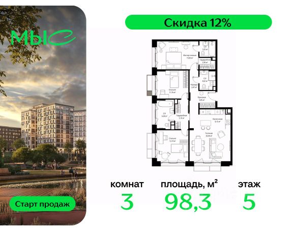 Прямая продажа от застройщика. Продаётся 3-комнатная квартира общей площадью 116.58 м² без отделки в премиальном жилом комплексе "МЫС" на 5-м этаже 6 этажного дома. Квартира расположена в клубном доме 10. Особенности квартир в клубном доме: - Приватная благоустроенная территория со своим выходом в лес; - Высота окон 3 метра, окна в пол. Ширина от 3-х метров; - Просторные лоджии и террасы; - Все квартиры видовые; - Двухуровневые квартиры со входом с террасы первого этажа; - Камины на верхних этажах; - Максимальное количество квартир на этаже от 2-4. Проект МЫС — это, прежде всего, идеальное место для семей. В рамках проекта построят государственную школу, два детских сада и дворец спорта площадью 20 000 м2 с термальным комплексом, выплывным бассейном, фитнес-залом, теннисными, сквош и падел кортами и секциями для детей. На территории площадью, сравнимой с тремя парками Зарядье, появятся кафе и рестораны, пруд с набережной, спортивные и детские площадки, скейт-парк, лыжные и веломаршруты. Расположение: - 2 минуты до скоростной трассы М1 и Минского шоссе; - 10 минут до МКАД; - 15 минут до МЦД Лесной Городок - 20 минут до делового центра "Москва-Сити"; - 28 минут до аэропорта "Внуково". Благоустройство: - велосипедные и лыжные маршруты; - собственная набережная и парк; - лаунж-зоны в окружении природы; - беседки у очага; - дворец спорта площадью 20 000 м²; - термальный комплекс с тремя бассейнами; - 4 теннисных и падел-корта; - 6 сквош-кортов; - многофункциональный спортзал; - скейт-парк; - просторная площадь для прогулок с фонтаном; - детский Клуб с творческими секциями; - гастро-доминанта; - кафе у пруда, рестораны, ритейл. Окружение - соседство с лесным фондом; - школа на 1250 мест и 2 детских сада на 350 и 255 мест; - Дубковский и Подушкинский леса, парк "Рассказовка", Мещерский парк. Действуют специальные условия при 100% оплате, подробности уточняйте у менеджера в офисе продаж.