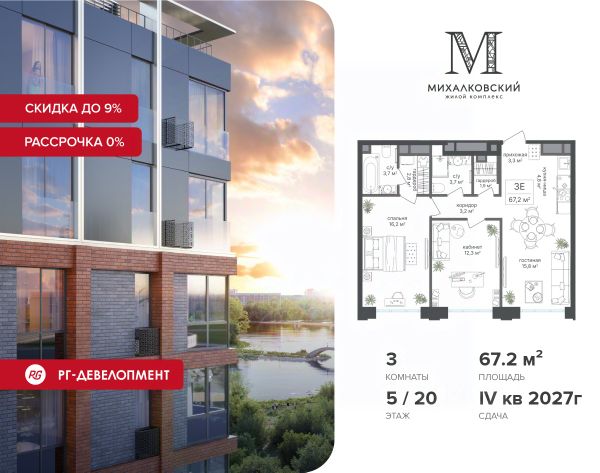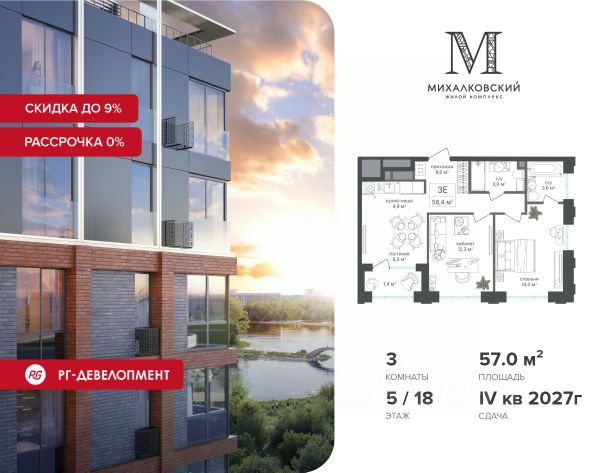При приобретении квартиры доступна беспроцентная рассрочка с первым платежом от 30%. У покупателя также есть право воспользоваться скидкой в размере 5% от полной стоимости квартиры. - Первый платеж составляет 30% от стоимости объекта и вносится при заключении ДДУ - Второй платеж в размере 30% от стоимости объекта вносится через 6 месяцев с даты заключения ДДУ - Остаток 20% через 12 месяцев с даты заключения ДДУ, но не позднее 30.06.2027 - Остаток 20% не позднее 30.06.2027 - Действует на приобретение квартир в корп. 2, 7 Продаётся 3-к квартира 57,0 кв.м. в ЖК "Михалковский" на 5-м этаже 18 этажного дома. Скидка 9% при покупке квартиры! Ипотека для каждого! Полная стоимость кредита от 12,380% до 18,537%. Ставка от 0,11% в АО "Альфа-Банк", ген. лицензия ЦБ РФ 1326 от 16.01.2015. Ставка фиксируется на первые 12 месяцев, далее полная стоимость кредита от 22,022% до 24,599% ставка 21,59%. Первоначальный взнос — от 20,1% от стоимости квартиры. Срок кредитования — от 4 до 30 лет. Компания "РГ-Девелопмент" предоставляет скидку на квартиры в жилом комплексе. Акция действительна до 31.03.2026 включительно. Для того чтобы воспользоваться предложением, необходимо подписать договор на приобретение недвижимости до 31.03.2026 включительно. Действует программа "Растет семья - растет и квартира". Компания "РГ-Девелопмент" вошла в ТОП-10 девелоперов по объёму введённого жилья в "Старой Москве" по итогам 2025 года. Прямая продажа от застройщика! Квартиры без отделки. Срок сдачи IV кв. 2027г. Особенности проекта: Завораживающие виды Красивое благоустройство Уникальная локация для Москвы (рядом Головинский парк, пруды, усадьба Михалково) Рядом с центром В проекте присутствует: архитектура голландского бюро MLA+, зеленые зоны, транспортная доступность, благоустроенная территория, подземный паркинг, детский сад и выход на Головинский парк с пятью прудами. Название комплекса указывает на одну из его черт - соседство с имением Михалково. Позвольте себе жить в месте, где проводили свой досуг династии Дашковых и Паниных.