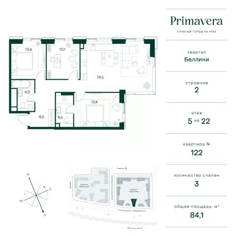 Клубный город на реке Primavera — это современный жилой комплекс премиум-класса, расположенный на первой береговой линии Москвы-реки в экологически чистом районе Покровское-Стрешнево. Под панорамными окнами квартир находится собственный экопарк с продуманной сетью прогулочных дорожек и современными детскими и спортивными площадками. За парком расположена набережная с собственным пляжем и зонами для отдыха. Клубный город на реке Primavera предлагает широкий выбор планировок для различных жизненных сценариев: от просторных однокомнатных квартир до пентхаусов и жилых помещений с террасами и патио. Выберите из 120 вариантов эргономичных планировок стандартного и евроформата. Из каждой квартиры открываются красивые виды на реку с углом обзора в 270 градусов. Дизайнерские лобби предлагают панорамный обзор на благоустроенный двор. Высокие потолки в 6 метров и качественная отделка создают атмосферу, схожую с пятизвездочными отелями. В Primavera есть всё необходимое для комфортной жизни в мегаполисе: • Образование для детей в шаговой доступности: 4 школы, 8 детских садов и развивающие центры с кружками и секциями. • Удобства на расстоянии приятной прогулки: супермаркеты, кафе, рестораны с верандами, салоны красоты, аптеки и многофункциональный центр для шоппинга и развлечений. • Умный дом: автоматизированное бесконтактное управление основными системами доступа и безопасности через мобильное приложение. Клубный город на реке Primavera выгодно сочетает комфорт городской жизни с близостью к природе. Живите в месте, где все создано для вашего удобства!