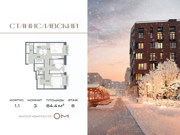 Продаётся 3-комнатная квартира 65, площадью 57,44 м², на 6 этаже в ЖК "Аникеевский" корпус 12/1. Стоимость — от 12806423 руб. Квартира без отделки, планировка распашная, окна во двор.