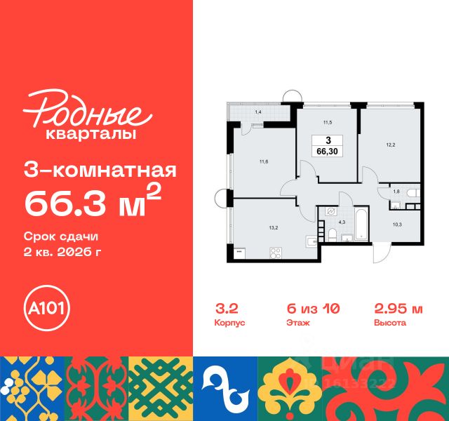 Продается трехкомнатная квартира 349 в новостройке Жилой район "Родные кварталы" по адресу Москва, ТиНАО, Новомосковский АО, Марушкинское С/П, жилой комплекс Родные Кварталы, 3.3, район Внуково, Новомосковский административный округ, Москва. Общая площадь квартиры - 79.10 кв. м., этаж 6 из 10, секция 8. Тип проекта, по которому построен дом - монолит, компания-застройщик - ООО "А101". Стоимость квартиры - 24229121 Р. Срок сдачи - 2 квартал 2026. ПРЕДЛОЖЕНИЯ ОТ ЗАСТРОЙЩИКА В ФЕВРАЛЕ 2026: Скидки до 10% на все квартиры. Только в офисах продаж до 28 февраля. Ипотека от 13,9 % для всех! На весь срок. "Семейная ипотека" вернулась. Ставка от 3,5 % на весь срок! Без удорожания! Выгодное ипотечное комбо: Ипотека от 2200 р./мес. и от 6 % после рождения ребёнка! Ипотека для всех "Держи пять!" - ставка 5 % на 2 года! *более подробную информацию по скидкам и акциям уточняйте в отделе продаж ЖК "Родные кварталы" строится в экологически благоприятной локации, рядом с парком Изварино и Ульяновским лесопарком. До станции метро "Аэропорт Внуково" и МЦД "Толстопальцево" - 15 мин. на транспорте. До Боровского, Киевского, Минского шоссе - 3, 6 и 20 минут соответственно Основная концепция благоустройства - воссоздание колорита разных регионов России. Этот же принцип использован в благоустройстве и озеленении района от бюро GAFA. Лесопарк, зоны отдыха, пешеходный бульвар со спуском в виде амфитеатра к набережной и центральной торговой площади, спортивные площадки. В шаговой доступности откроются детские сады и школа, поликлиника. На первых этажах домов - спортклубы, клиники, аптеки, супермаркеты, кафе и многое другое. Цветовые решения лобби также созвучны климатическим зонам России. Здесь появятся зоны ожидания с гостевыми санузлами и колясочными. Предусмотрены подземные паркинги и кладовые. Преимущества "Родных кварталов" - уютная атмосфера "малой родины" - полноценная инфраструктура внутри района - выезд на ключевые шоссе - от 3 минут на автомобиле - малоэтажная застройка