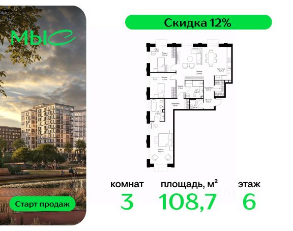 Прямая продажа от застройщика. Продаётся 3-комнатная квартира общей площадью 103.31 м² без отделки в премиальном жилом комплексе "МЫС" на 6-м этаже 12 этажного дома. Проект МЫС — это, прежде всего, идеальное место для семей. В рамках проекта построят государственную школу, два детских сада и дворец спорта площадью 20 000 м2 с термальным комплексом, выплывным бассейном, фитнес-залом, теннисными, сквош и падел кортами и секциями для детей. На территории площадью, сравнимой с тремя парками Зарядье, появятся кафе и рестораны, пруд с набережной, спортивные и детские площадки, скейт-парк, лыжные и веломаршруты. Расположение: - 2 минуты до скоростной трассы М1 и Минского шоссе; - 10 минут до МКАД; - 15 минут до МЦД Лесной Городок - 20 минут до делового центра "Москва-Сити"; - 28 минут до аэропорта "Внуково". Благоустройство: - велосипедные и лыжные маршруты; - собственная набережная и парк; - лаунж-зоны в окружении природы; - беседки у очага; - дворец спорта площадью 20 000 м²; - термальный комплекс с тремя бассейнами; - 4 теннисных и падел-корта; - 6 сквош-кортов; - многофункциональный спортзал; - скейт-парк; - просторная площадь для прогулок с фонтаном; - детский Клуб с творческими секциями; - гастро-доминанта; - кафе у пруда, рестораны, ритейл. Окружение - соседство с лесным фондом; - школа на 1250 мест и 2 детских сада на 350 и 255 мест; - Дубковский и Подушкинский леса, парк "Рассказовка", Мещерский парк. Действуют специальные условия при 100% оплате, подробности уточняйте у менеджера в офисе продаж.