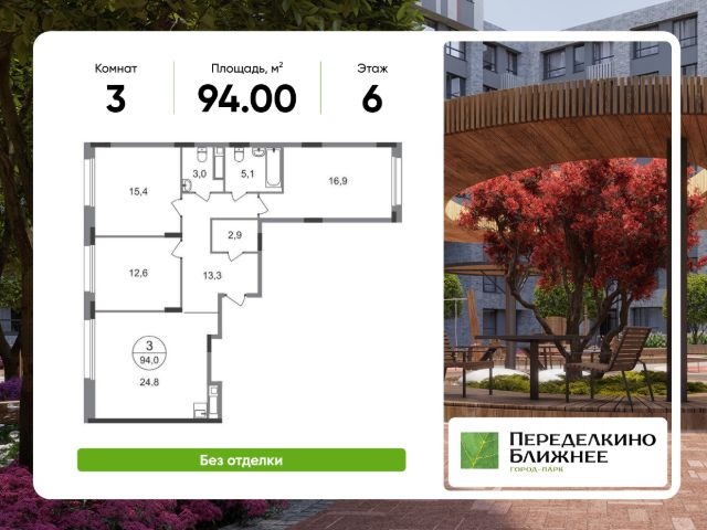 Продается трехкомнатная квартира в городе-парке "Переделкино Ближнее". Общая площадь квартиры - 64,8 кв. м, этаж 6 из 17. Срок сдачи - 1 квартал 2028 года. Тип дома - монолитный. Корпус расположен в новой 13 фазе строительства и состоит из 8 секций с переменной этажностью 12-17 этажей. Все секции без отделки. Около 13 фазы запланировано строительство многоуровневого паркинга на 300 м/мест. 13 фаза имеет уникальное расположение и находится непосредственно на берегу Федосьинского пруда, который является сердцем города-парка "Переделкино Ближнее". Город-парк "Переделкино Ближнее" расположен в 8 км от МКАД по Боровскому шоссе. ТРАНСПОРТНАЯ ДОСТУПНОСТЬ: - 15 минут пешком до станции МЦД-4 "Мичуринец" - 25 минут пешком до станции метро "Рассказовка" Солнцевской линии - 30 минут до центра Москвы - 2026 г. - открытие трассы Солнцево-Бутово-Варшавское шоссе РАЗВИТАЯ СОЦИАЛЬНАЯ ИНФРАСТРУКТУРА: - 7 детских садов, 3 школы - банки, продуктовые магазины, аптеки, фитнес центры, салоны красоты и пр БЛАГОУСТРОЙСТВО: - дворы без машин - игровые зоны и развивающие детские площадки - зоны для созерцательного и медитативного отдыха - зоны для занятий спортом ОСОБЕННОСТИ АРХИТЕКТУРЫ: - высокие потолки от 3,03 м - безбарьерные входные группы - колясочные в каждой входной группе - кладовые помещения расположены на -1 этаже каждой секции - в каждой секции 2 лифта: 1 пассажирский, 1 грузовой - на фасаде предусмотрены корзины для установки кондиционеров АВТОРСКИЙ ДИЗАЙН: Входные группы выполнены по авторскому дизайну, благодаря панорамному остеклению наполнены естественным светом. В каждой входной группе будет располагаться комфортабельная зона ожидания с возможностью зарядить электронные устройства, почтовые ящики, колясочная, акцентные пуфы и столик.