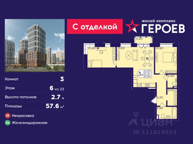 Продаётся 3-комнатная квартира 59.5 кв. м. в жилом комплексе "Героев" в Балашихе, Железнодорожный. Квартира расположена на 6 этаже 610 корпуса. Все квартиры представлены с чистовой отделкой. Вам не нужно тратить время и дополнительные финансы на ремонт или жить в шуме строительных работ - достаточно перевести свои вещи, расставить мебель и всё готово! Жилой квартал "Героев" - это уютный проект для семей с детьми. Всего 40 минут до центра Москвы. В квартале созданы все условия для досуга всех возрастов: игровые и спортивные площадки, места для отдыха и прогулок, магазины, кафе и пункты выдачи. За 15 минут можно дойти от дома до Ольгинского лесопарка - популярного места для прогулок и отдыха на свежем воздухе. Здесь приятно гулять всей семьёй, заниматься спортом или устроить пикник в выходной день. Преимущества: Квартира с готовой отделкой. Пространство полностью подготовлено для жизни: не нужно тратить время и деньги на ремонт или ждать его окончания. После получения ключей достаточно расставить мебель - и можно сразу заезжать и жить. Продуманные и светлые планировки. Просторные кухни-гостиные создают комфортное пространство для отдыха и встреч с близкими. В квартирах предусмотрены удобные гардеробные, благодаря чему легко поддерживать порядок и не перегружать комнаты шкафами. Увеличенное остекление. Большие окна наполняют квартиру естественным светом в течение всего дня, создавая ощущение простора и уюта, а также визуально расширяя пространство и делая интерьер более воздушным. Пешая доступность до станции Железнодорожная (МЦД-4) - дорога займёт не более 30 минут до центра Москвы: станции метро "Курская", "Площадь Ильича" или ТПУ Нижегородская.