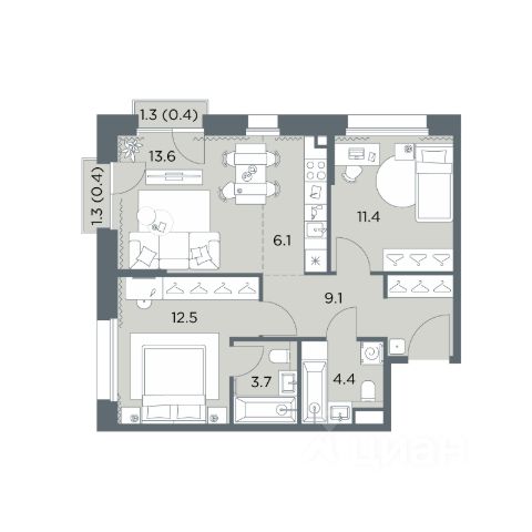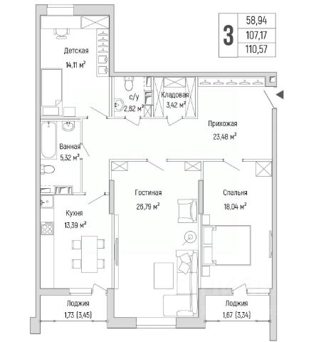 • ✅ Минимальная площадь: 57,5 м²