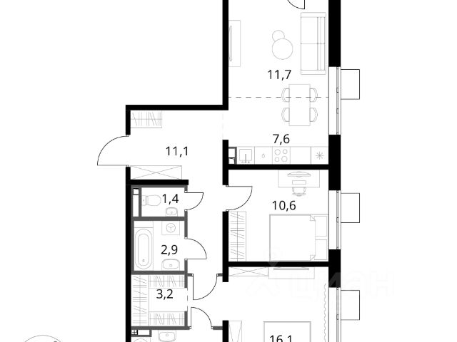 Квартира с кухней-гостиной и тремя спальнями в "Первом квартале". Особенности планировки: окна на две стороны, второй санузел, гардеробная, вид во двор, предчистовая отделка, балкон. квартиры в нашей базе: МТК02-Ж3.6.2.