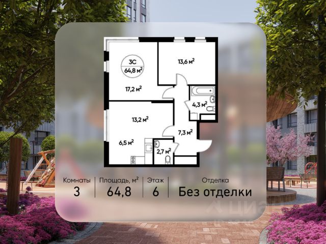 Продается трехкомнатная квартира без отделки в городе-парке "Переделкино Ближнее". Общая площадь квартиры - 64,8 кв. м, этаж 6 из 17. Срок сдачи - 1 квартал 2028 года. Тип дома - монолитный. ТОЛЬКО ДО 30 АПРЕЛЯ выгодные условия на приобретение квартиры в ипотеку или рассрочку. Звоните - и мы подберем оптимальное предложение под ваш запрос! Корпус расположен в 13 фазе строительства и состоит из 8 секций с переменной этажностью 12-17 этажей. Все секции без отделки. Около 13 фазы запланировано строительство многоуровневого паркинга на 300 м/мест. 13 фаза имеет уникальное расположение и находится непосредственно на берегу Федосьинского пруда, который является сердцем города-парка "Переделкино Ближнее". Город-парк "Переделкино Ближнее" расположен в 8 км от МКАД по Боровскому шоссе. ТРАНСПОРТНАЯ ДОСТУПНОСТЬ: - 15 минут пешком до станции МЦД-4 "Мичуринец" - 25 минут пешком до станции метро "Рассказовка" Солнцевской линии - 30 минут до центра Москвы - 2026 г. - открытие трассы Солнцево-Бутово-Варшавское шоссе РАЗВИТАЯ СОЦИАЛЬНАЯ ИНФРАСТРУКТУРА: - 7 детских садов, 3 школы - банки, продуктовые магазины, аптеки, фитнес центры, салоны красоты и пр БЛАГОУСТРОЙСТВО: - дворы без машин - игровые зоны и развивающие детские площадки - зоны для созерцательного и медитативного отдыха - зоны для занятий спортом ОСОБЕННОСТИ АРХИТЕКТУРЫ: - высокие потолки от 3,03 м - безбарьерные входные группы - колясочные в каждой входной группе - кладовые помещения расположены на -1 этаже каждой секции - в каждой секции 2 лифта: 1 пассажирский, 1 грузовой - на фасаде предусмотрены корзины для установки кондиционеров АВТОРСКИЙ ДИЗАЙН: Входные группы выполнены по авторскому дизайну, благодаря панорамному остеклению наполнены естественным светом. В каждой входной группе будет располагаться комфортабельная зона ожидания с возможностью зарядить электронные устройства, почтовые ящики, колясочная, акцентные пуфы и столик.