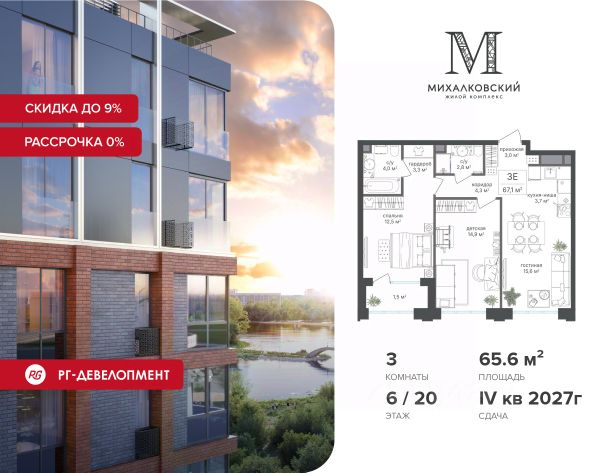 При приобретении квартиры доступна беспроцентная рассрочка с первым платежом от 30%. У покупателя также есть право воспользоваться скидкой в размере 5% от полной стоимости квартиры. - Первый платеж составляет 30% от стоимости объекта и вносится при заключении ДДУ - Второй платеж в размере 30% от стоимости объекта вносится через 6 месяцев с даты заключения ДДУ - Остаток 20% через 12 месяцев с даты заключения ДДУ, но не позднее 30.06.2027 - Остаток 20% не позднее 30.06.2027 - Действует на приобретение квартир в корп. 2, 7 Продаётся 3-к квартира 57,3 кв.м. в ЖК "Михалковский" на 6-м этаже 9 этажного дома. Скидка 9% при покупке квартиры! Ипотека для каждого! Полная стоимость кредита от 12,380% до 18,537%. Ставка от 0,11% в АО "Альфа-Банк", ген. лицензия ЦБ РФ 1326 от 16.01.2015. Ставка фиксируется на первые 12 месяцев, далее полная стоимость кредита от 22,022% до 24,599% ставка 21,59%. Первоначальный взнос — от 20,1% от стоимости квартиры. Срок кредитования — от 4 до 30 лет. Компания "РГ-Девелопмент" предоставляет скидку на квартиры в жилом комплексе. Акция действительна до 31.03.2026 включительно. Для того чтобы воспользоваться предложением, необходимо подписать договор на приобретение недвижимости до 31.03.2026 включительно. Действует программа "Растет семья - растет и квартира". Компания "РГ-Девелопмент" вошла в ТОП-10 девелоперов по объёму введённого жилья в "Старой Москве" по итогам 2025 года. Прямая продажа от застройщика! Квартиры без отделки. Срок сдачи IV кв. 2027г. Особенности проекта: Малоэтажный клубный формат Панорамные окна Авторский ландшафт Уникальная локация для Москвы (рядом Головинский парк и пруды, усадьба Михалково) Рядом с центром Современная архитектура, выразительные линии, натуральные материалы — этот дом создан для тех, кто ценит приватность и статус. Концепция продумана международным бюро MLA+ с вниманием к пропорциям, особенной утонченности и комфорту. Панорамные окна стирают границы с природой. Фасад — из авторской плитки созданной по индивидуальному заказу. Особое внимание — безопасности и приватности. У дома закрытый двор. А отдельный выход в парк подарит ощущение уединенности даже в большом городе. Вся территория — под видеонаблюдением, чтобы дома всегда чувствовалось спокойствие. Во дворе — только ваш ритм, художественные виды и чувство защищенности.