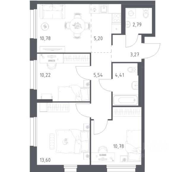 В продаже 3-комнатная квартира в корпусе 30 ЖК 'Новое Внуково'. Квартира располагается на 7 этаже, общая площадь 78.56 м2.