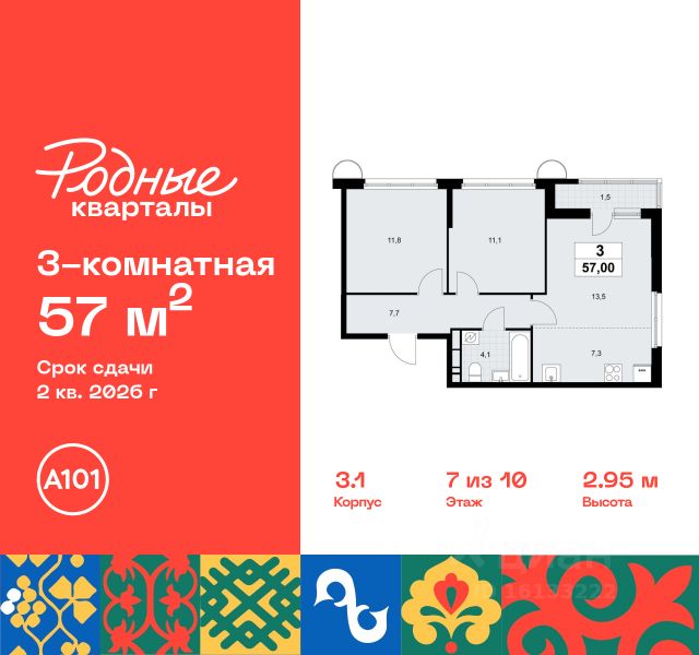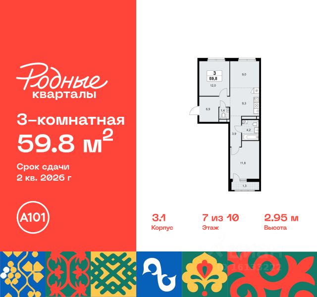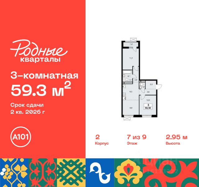 Старт продаж нового корпуса! Продается трехкомнатная квартира без отделки в 11 фазе города-парка "Первый Московский". Общая площадь квартиры - 94,9 кв. м, этаж 7 из 22. Планируемый срок ввода в эксплуатацию - 1 квартал 2029 года. Тип дома - монолитный. 5 корпус состоит из 2 секций: - 1 секция - без отделки - 2 секция - с отделкой White Box Город-парк "Первый Московский" расположен всего в 7 км по Киевскому шоссе от МКАД на территории Новой Москвы. Из города-парка прямой выезд на Киевское шоссе и трассу Солнцево-Бутово-Варшавское шоссе. ТРАНСПОРТНАЯ ДОСТУПНОСТЬ: - 7 мин. на личном автомобиле или 10 мин. на автобусе до станции метро "Филатов Луг" - 10 мин. на автомобиле или 20 мин. на автобусе до станции метро "Рассказовка" или "Саларьево" ПРЕИМУЩЕСТВА 5 КОРПУСА: - живописные виды на Ульяновский лесопарк - входные группы с безбарьерным входом - просторная колясочная в каждой секции - в каждой секции - 3 лифта: 2 пассажирских, 1 грузовой - количество квартир на этаже: 1 секция - 4 квартиры, 2 секция - 5 квартир - на 1-ом этаже в секции 2 расположено коммерческое помещение - на -1-ом этаже каждой секции запроектированы кладовые помещения - обеспеченность машино-местами: гостевой паркинг 48 м/м, многоуровневые паркинги рядом с домом ВНУТРЕННЯЯ ИНФРАСТРУКТУРА И БЛАГОУСТРОЙСТВО: Дома 11 фазы граничат с Ульяновским лесопарком. Вся территория 11 фазы разделена на 2 типа: - приватное дворовое пространство с детскими игровыми и спортивными площадками. Дворы свободны от машин. - прогулочные маршруты с зонами отдыха. Прогулочный маршрут объединяет дома 11 фазы в единое пространство, за счёт оригинальной геопластики создаётся уникальный разноуровневый ландшафтный узор. РАЗВИТАЯ ИНФРАСТРУКТУРА В ОКРУЖЕНИИ: - общеобразовательная школа 2120 корпус ш3 (всего в проекте 5 школ) - детский сад 2120 корпус д4 (всего в проекте 8 детских садов) - школа искусств - поликлиника - торговый центр Столица - кафе, продуктовые магазины, аптеки, фитнес центры, салоны красоты и пр. - в пешей доступности благоустроенный парк Филатов Луг