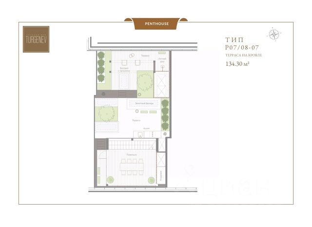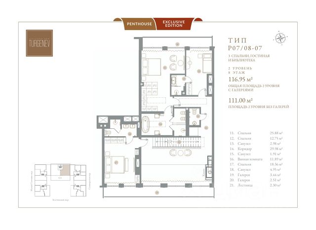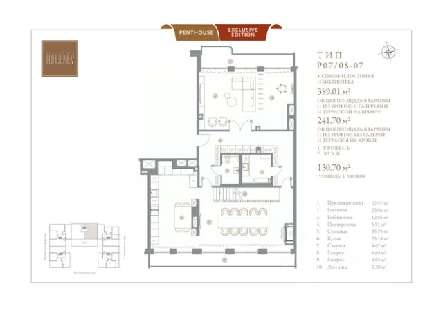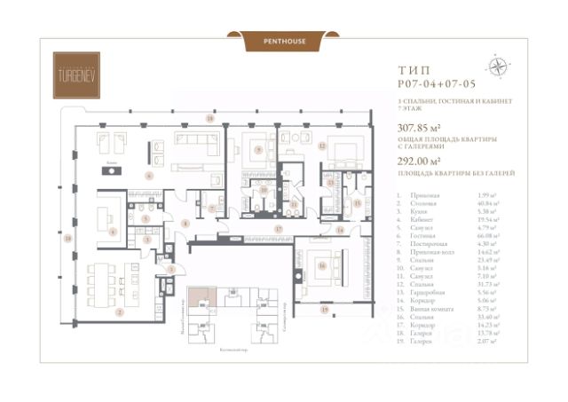 Одна из двух самых просторных квартир в доме: Пентхаус с 3 спальнями, 292 м2, 7 этаж Клубного дома TURGENEV.