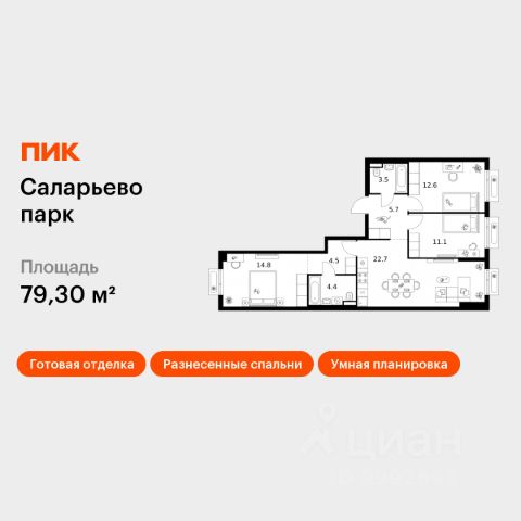 Продается трехкомнатная квартира с отделкой в 9 фазе города-парка "Первый Московский". Общая площадь квартиры - 82,3 кв. м, этаж 7 из 19. Срок сдачи - 2 квартал 2026 года. Тип дома - монолитный. В квартире будет выполнена высококачественная отделка "под ключ". На выбор представлены два стиля отделки: - Classic (классический стиль) - традиционное сочетание материалов и фактур - тёмный, тёплый по тону пол и светлые нейтральные стены, керамогранит с рисунком под мрамор. - Smart+ (современный стиль) - нейтральная цветовая гамма с использованием бетонных фактур и темного керамогранита, керамическая плитка до потолка в ванной и санузле. Независимо от того, какой стиль отделки выберите Вы, можете быть уверенными, что цветовое сочетание будет актуальным долгие годы. Город-парк "Первый Московский" расположен всего в 7 км по Киевскому шоссе (Новая Москва). Из города-парка есть удобный выезд на Киевское шоссе. ТРАНСПОРТНАЯ ДОСТУПНОСТЬ: - 5 мин. на личном автомобиле или 10 мин. на автобусе 189 и 876 до станции метро "Филатов Луг" - 20 мин. пешком до станции метро "Филатов Луг" ИНФРАСТРУКТУРА И БЛАГОУСТРОЙСТВО: 9 фаза сочетает в себе максимальную близость данной фазы строительства к парку Филатов луг. Основной акцент в благоустройстве сделан на разнообразные детские площадки и развивающие комплексы, с зонами для активного и спокойного отдыха взрослых. В каждом из домов предусмотрены кладовые помещения на -1 этаже и коммерческие помещения на 1 этаже. АВТОРСКИЙ ДИЗАЙН: Входные группы выполнены по авторскому дизайну, оснащены системой "тёплый пол". В каждой входной группе будет располагаться комфортабельная зона ожидания. При входе предусмотрено помещение для хранения колясок и на -1 этаже располагается велопарковка.