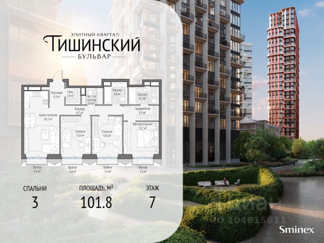 В продаже 3-комнатная квартира квартира в элитном квартале "Тишинский бульвар". Общая площадь квартиры - 114.10 кв.м. Этаж 7 из 11. Корпус Ивовый 5. "Тишинский бульвар" - тихий зелёный элитный квартал на Тишинке, в престижном и комфортном районе центра Москвы. В нём создан уникальный для элитного дома прогулочный бульвар в своём огромном парке 1,9 га. В парке оборудованы зоны для активного и тихого отдыха, крытые галереи, приватные зелёные комнаты, многофункциональная спортивная площадка, воркаут-зона, детская площадка, сухой фонтан, ручей. В пешей доступности Римско-католический кафедральный собор. Всего в полутора километрах от квартала находятся Патриаршие пруды - излюбленное место для летних прогулок, воскресных бранчей и романтических ужинов. Белая площадь расположена ещё ближе - на расстоянии 1,2 километра. Это точка концентрации деловой жизни и модных ресторанов. В "Тишинский бульваре" только для жителей и их гостей создан уникальный для элитного дома прогулочный бульвар в собственном огромном парке площадью 2,1 га, который занимает 70% территории квартала. Бульвар проходит через весь квартал и объединяет в общее пространство три двора: Кленовый, Рябиновый и Ивовый. В парке созданы крытые галереи и приватные зелёные комнаты для отдыха и медитаций в любую погоду. Насыщенное озеленение многолетними растениями с разными периодами цветения сохраняет территорию квартала красивой круглый год. В квартале насыщенная инфраструктура только для жителей, включая Clubhouse. Здесь оборудованы пространства для здорового образа жизни по стандарту FIT LAB: в парке - многофункциональная спортивная площадка, воркаут-зона, место для занятий йогой и медитации; бесплатный фитнес-клуб с бассейном. Для маленьких жителей доступны детская площадка и игровая комната по стандарту KIDS LAB. Дома оснащены самыми полными и лучшими системами.